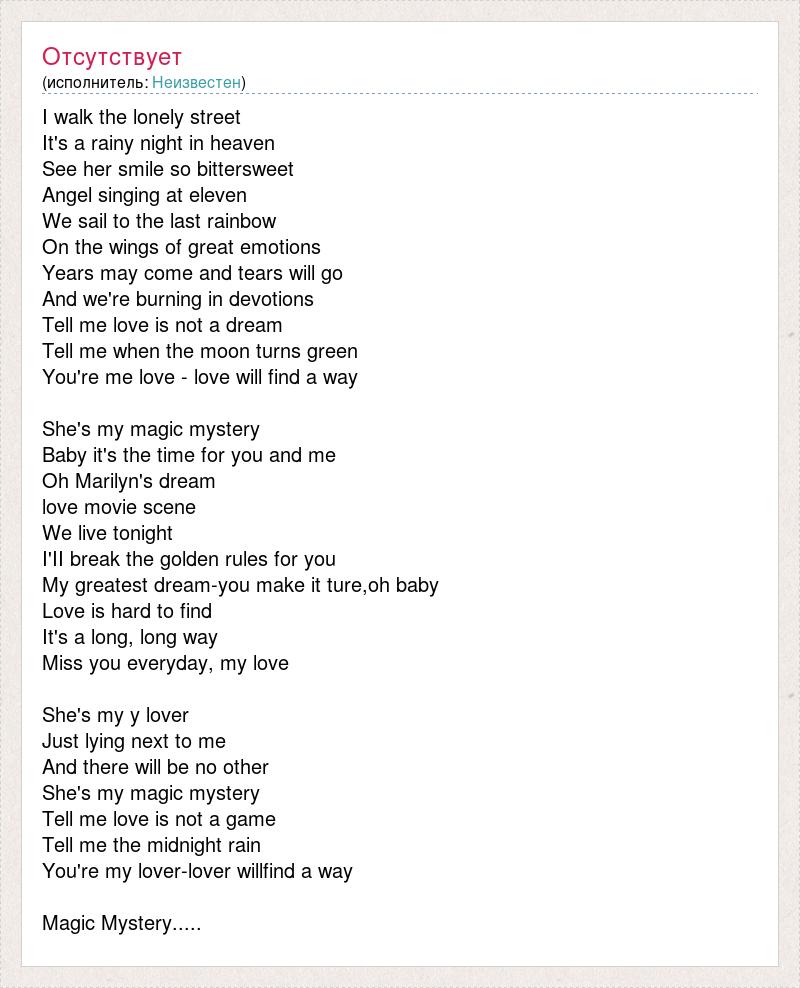 I walk the lonely street It's a rainy night in heaven See her smile so bittersweet Angel singing at eleven We sail to the last rainbow On the wings of great emotions Years may come and tears will go And we're burning in devotions Tell me love is not a dream Tell me when the moon turns green You're me love - love will find a way She's my magic mystery Baby it's the time for you and me Oh Marilyn's dream love movie scene We live tonight I'II break the golden rules for you My greatest dream-you make it ture,oh baby Love is hard to find It's a long, long way Miss you everyday, my love She's my y lover Just lying next to me And there will be no other She's my magic mystery Tell me love is not a game Tell me the midnight rain You're my lover-lover willfind a way Magic Mystery.....