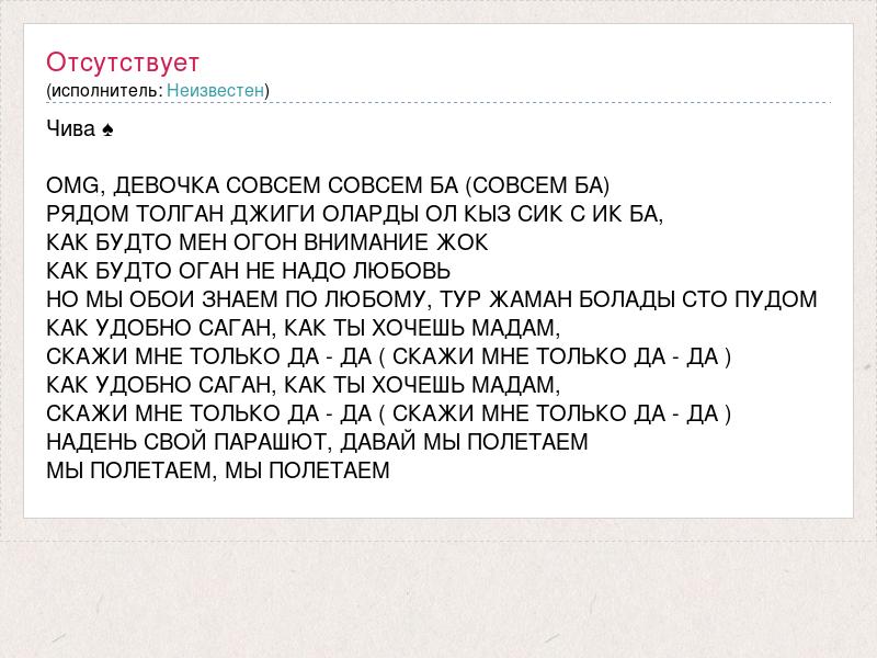 Чива ♠ OMG, ДЕВОЧКА СОВСЕМ СОВСЕМ БА (СОВСЕМ БА) РЯДОМ ТОЛГАН ДЖИГИ ОЛАРДЫ ОЛ КЫЗ СИК С ИК БА, КАК БУДТО МЕН ОГОН ВНИМАНИЕ ЖОК КАК БУДТО ОГАН НЕ НАДО ЛЮБОВЬ НО МЫ ОБОИ ЗНАЕМ ПО ЛЮБОМУ, ТУР ЖАМАН БОЛАДЫ СТО ПУДОМ КАК УДОБНО САГАН, КАК ТЫ ХОЧЕШЬ МАДАМ, СКАЖИ МНЕ ТОЛЬКО ДА - ДА ( СКАЖИ МНЕ ТОЛЬКО ДА - ДА ) КАК УДОБНО САГАН, КАК ТЫ ХОЧЕШЬ МАДАМ, СКАЖИ МНЕ ТОЛЬКО ДА - ДА ( СКАЖИ МНЕ ТОЛЬКО ДА - ДА ) НАДЕНЬ СВОЙ ПАРАШЮТ, ДАВАЙ МЫ ПОЛЕТАЕМ МЫ ПОЛЕТАЕМ, МЫ ПОЛЕТАЕМ