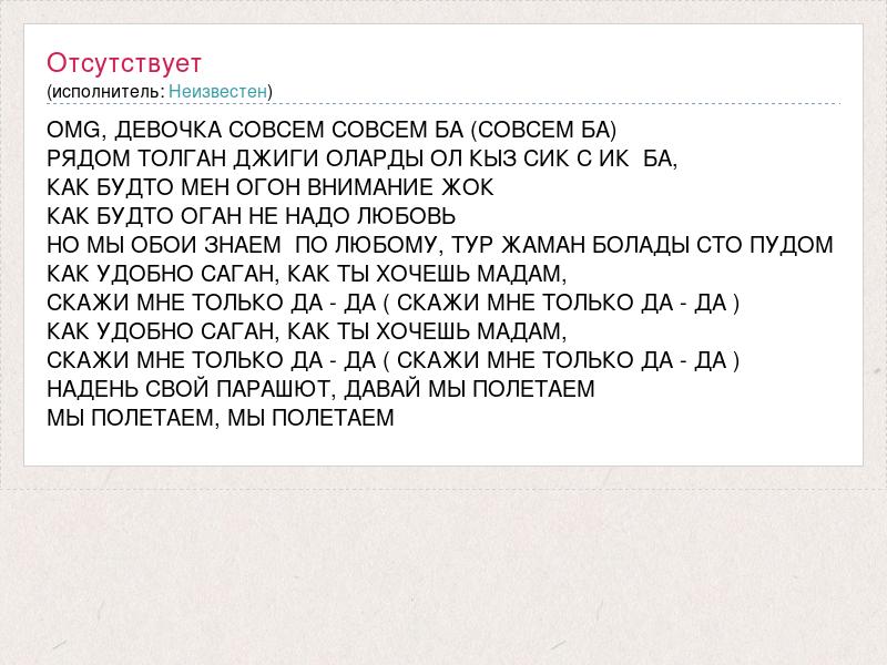 OMG, ДЕВОЧКА СОВСЕМ СОВСЕМ БА (СОВСЕМ БА) РЯДОМ ТОЛГАН ДЖИГИ ОЛАРДЫ ОЛ КЫЗ СИК С ИК БА, КАК БУДТО МЕН ОГОН ВНИМАНИЕ ЖОК КАК БУДТО ОГАН НЕ НАДО ЛЮБОВЬ НО МЫ ОБОИ ЗНАЕМ ПО ЛЮБОМУ, ТУР ЖАМАН БОЛАДЫ СТО ПУДОМ КАК УДОБНО САГАН, КАК ТЫ ХОЧЕШЬ МАДАМ, СКАЖИ МНЕ ТОЛЬКО ДА - ДА ( СКАЖИ МНЕ ТОЛЬКО ДА - ДА ) КАК УДОБНО САГАН, КАК ТЫ ХОЧЕШЬ МАДАМ, СКАЖИ МНЕ ТОЛЬКО ДА - ДА ( СКАЖИ МНЕ ТОЛЬКО ДА - ДА ) НАДЕНЬ СВОЙ ПАРАШЮТ, ДАВАЙ МЫ ПОЛЕТАЕМ МЫ ПОЛЕТАЕМ, МЫ ПОЛЕТАЕМ