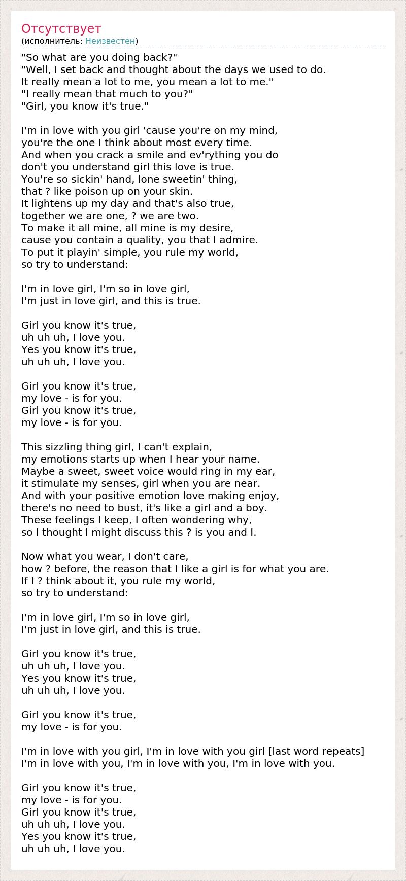 "So what are you doing back?" "Well, I set back and thought about the days we used to do. It really mean a lot to me, you mean a lot to me." "I really mean that much to you?" "Girl, you know it's true." I'm in love with you girl 'cause you're on my mind, you're the one I think about most every time. And when you crack a smile and ev'rything you do don't you understand girl this love is true. You're so sickin' hand, lone sweetin' thing, that ? like poison up on your skin. It lightens up my day and that's also true, together we are one, ? we are two. To make it all mine, all mine is my desire, cause you contain a quality, you that I admire. To put it playin' simple, you rule my world, so try to understand: I'm in love girl, I'm so in love girl, I'm just in love girl, and this is true. Girl you know it's true, uh uh uh, I love you. Yes you know it's true, uh uh uh, I love you. Girl you know it's true, my love - is for you. Girl you know it's true, my love - is for you. This sizzling thing girl, I can't explain, my emotions starts up when I hear your name. Maybe a sweet, sweet voice would ring in my ear, it stimulate my senses, girl when you are near. And with your positive emotion love making enjoy, there's no need to bust, it's like a girl and a boy. These feelings I keep, I often wondering why, so I thought I might discuss this ? is you and I. Now what you wear, I don't care, how ? before, the reason that I like a girl is for what you are. If I ? think about it, you rule my world, so try to understand: I'm in love girl, I'm so in love girl, I'm just in love girl, and this is true. Girl you know it's true, uh uh uh, I love you. Yes you know it's true, uh uh uh, I love you. Girl you know it's true, my love - is for you. I'm in love with you girl, I'm in love with you girl [last word repeats] I'm in love with you, I'm in love with you, I'm in love with you. Girl you know it's true, my love - is for you. Girl you know it's true, uh uh uh, I love you. Yes you know it's true, uh uh uh, I love you.