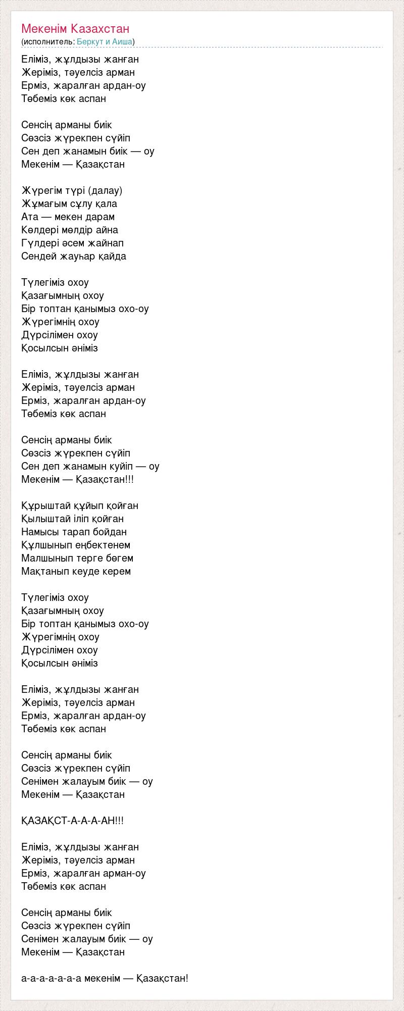 Еліміз, жұлдызы жанған Жеріміз, тәуелсіз арман Ерміз, жаралған ардан-оу Төбеміз көк аспан Сенсің арманы биік Сөзсіз жүрекпен сүйіп Сен деп жанамын биік — оу Мекенім — Қазақстан Жүрегім түрі (далау) Жұмағым сұлу қала Ата — мекен дарам Көлдері мөлдір айна Гүлдері әсем жайнап Сендей жауһар қайда Түлегіміз охоу Қазағымның охоу Бір топтан қанымыз охо-оу Жүрегімнің охоу Дүрсілімен охоу Қосылсын әніміз Еліміз, жұлдызы жанған Жеріміз, тәуелсіз арман Ерміз, жаралған ардан-оу Төбеміз көк аспан Сенсің арманы биік Сөзсіз жүрекпен сүйіп Сен деп жанамын куйiп — оу Мекенім — Қазақстан!!! Құрыштай құйып қойған Қылыштай іліп қойған Намысы тарап бойдан Құлшынып еңбектенем Малшынып терге бөгем Мақтанып кеуде керем Түлегіміз охоу Қазағымның охоу Бір топтан қанымыз охо-оу Жүрегімнің охоу Дүрсілімен охоу Қосылсын әніміз Еліміз, жұлдызы жанған Жеріміз, тәуелсіз арман Ерміз, жаралған ардан-оу Төбеміз көк аспан Сенсің арманы биік Сөзсіз жүрекпен сүйіп Сенімен жалауым биік — оу Мекенім — Қазақстан ҚАЗАҚСТ-A-A-A-АН!!! Еліміз, жұлдызы жанған Жеріміз, тәуелсіз арман Ерміз, жаралған арман-оу Төбеміз көк аспан Сенсің арманы биік Сөзсіз жүрекпен сүйіп Сенімен жалауым биік — оу Мекенім — Қазақстан a-a-a-a-a-a-a мекенім — Қазақстан!