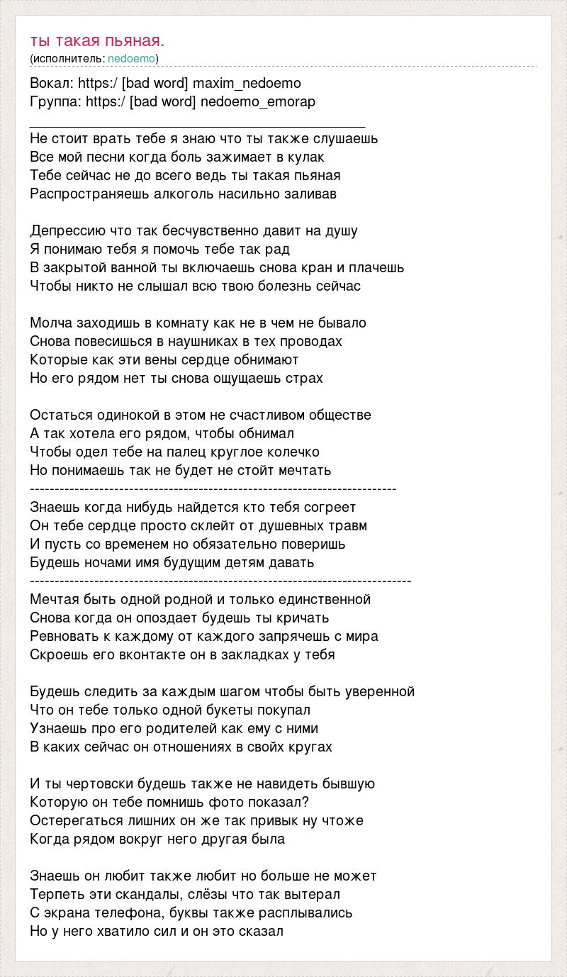 Вокал: https:/ [bad word] maxim_nedoemo Группа: https:/ [bad word] nedoemo_emorap ___________________________________________ Не стоит врать тебе я знаю что ты также слушаешь Все мой песни когда боль зажимает в кулак Тебе сейчас не до всего ведь ты такая пьяная Распространяешь алкоголь насильно заливав Депрессию что так бесчувственно давит на душу Я понимаю тебя я помочь тебе так рад В закрытой ванной ты включаешь снова кран и плачешь Чтобы никто не слышал всю твою болезнь сейчас Молча заходишь в комнату как не в чем не бывало Снова повесишься в наушниках в тех проводах Которые как эти вены сердце обнимают Но его рядом нет ты снова ощущаешь страх Остаться одинокой в этом не счастливом обществе А так хотела его рядом, чтобы обнимал Чтобы одел тебе на палец круглое колечко Но понимаешь так не будет не стойт мечтать -------------------------------------------------------------------------- Знаешь когда нибудь найдется кто тебя согреет Он тебе сердце просто склейт от душевных травм И пусть со временем но обязательно поверишь Будешь ночами имя будущим детям давать ----------------------------------------------------------------------------- Мечтая быть одной родной и только единственной Снова когда он опоздает будешь ты кричать Ревновать к каждому от каждого запрячешь с мира Скроешь его вконтакте он в закладках у тебя Будешь следить за каждым шагом чтобы быть уверенной Что он тебе только одной букеты покупал Узнаешь про его родителей как ему с ними В каких сейчас он отношениях в свойх кругах И ты чертовски будешь также не навидеть бывшую Которую он тебе помнишь фото показал? Остерегаться лишних он же так привык ну чтоже Когда рядом вокруг него другая была Знаешь он любит также любит но больше не может Терпеть эти скандалы, слёзы что так вытерал С экрана телефона, буквы также расплывались Но у него хватило сил и он это сказал