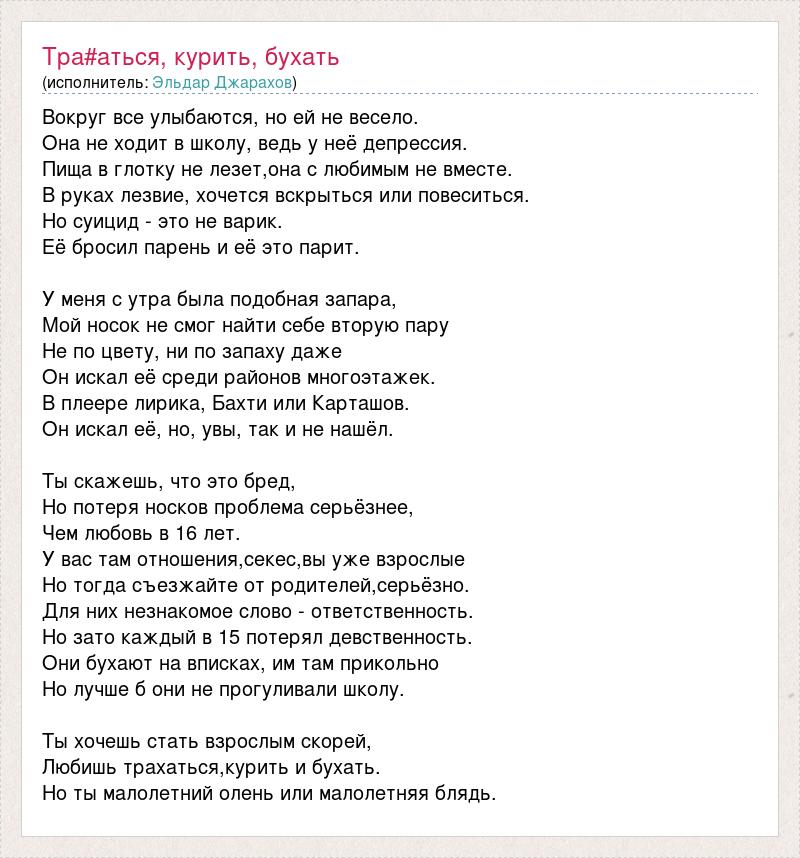 Вокруг все улыбаются, но ей не весело. Она не ходит в школу, ведь у неё депрессия. Пища в глотку не лезет,она с любимым не вместе. В руках лезвие, хочется вскрыться или повеситься. Но суицид - это не варик. Её бросил парень и её это парит. У меня с утра была подобная запара, Мой носок не смог найти себе вторую пару Не по цвету, ни по запаху даже Он искал её среди районов многоэтажек. В плеере лирика, Бахти или Карташов. Он искал её, но, увы, так и не нашёл. Ты скажешь, что это бред, Но потеря носков проблема серьёзнее, Чем любовь в 16 лет. У вас там отношения,секес,вы уже взрослые Но тогда съезжайте от родителей,серьёзно. Для них незнакомое слово - ответственность. Но зато каждый в 15 потерял девственность. Они бухают на вписках, им там прикольно Но лучше б они не прогуливали школу. Ты хочешь стать взрослым скорей, Любишь трахаться,курить и бухать. Но ты малолетний олень или малолетняя блядь.