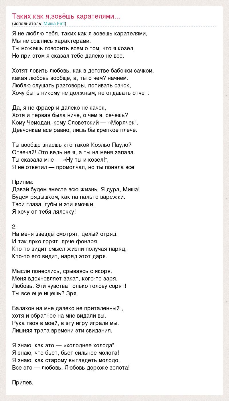 Я не люблю тебя, таких как я зовешь карателями, Мы не сошлись характерами. Ты можешь говорить всем о том, что я козел, Но при этом я сказал тебе далеко не все. Хотят ловить любовь, как в детстве бабочки сачком, какая любовь вообще, а, ты о чем? начнем. Люблю слушать разговоры, попивать сачок, Хочу быть никому не должным, не отдавать отчет. Да, я не фраер и далеко не качек, Хотя и первая была ниче, о чем я, сечешь? Кому Чемодан, кому Словетский — «Морячек”. Девчонкам все равно, лишь бы крепкое плече. Ты вообще знаешь кто такой Коэльо Пауло? Отвечай! Это ведь не я, а ты на меня запала. Ты сказала мне — «Ну ты и козел!”, Я не ответил — промолчал, но ты поняла все Припев: Давай будем вместе всю жизнь. Я дура, Миша! Будем рядышком, как на пальто варежки. Твои глаза, губы и эти ямочки. Я хочу от тебя лялечку! 2. На меня звезды смотрят, целый отряд. И так ярко горят, ярче фонаря. Кто-то видит смысл жизни получая наряд, Кто-то его видит, наряд этот даря. Мысли понеслись, срываясь с якоря. Меня вдохновляет закат, кого-то заря. Любовь. Эти чувства только голову сорят! Ты все еще ищешь? Зря. Балахон на мне далеко не приталенный , хотя и обратное на мне видали вы. Рука твоя в моей, в эту игру играли мы. Лишняя трата времени эти свидания. Я знаю, как это — «холоднее холода”. Я знаю, что бьет, бьет сильнее молота! Я знаю, как старому выглядеть молодо. Все это — любовь. Любовь дороже золота! Припев.