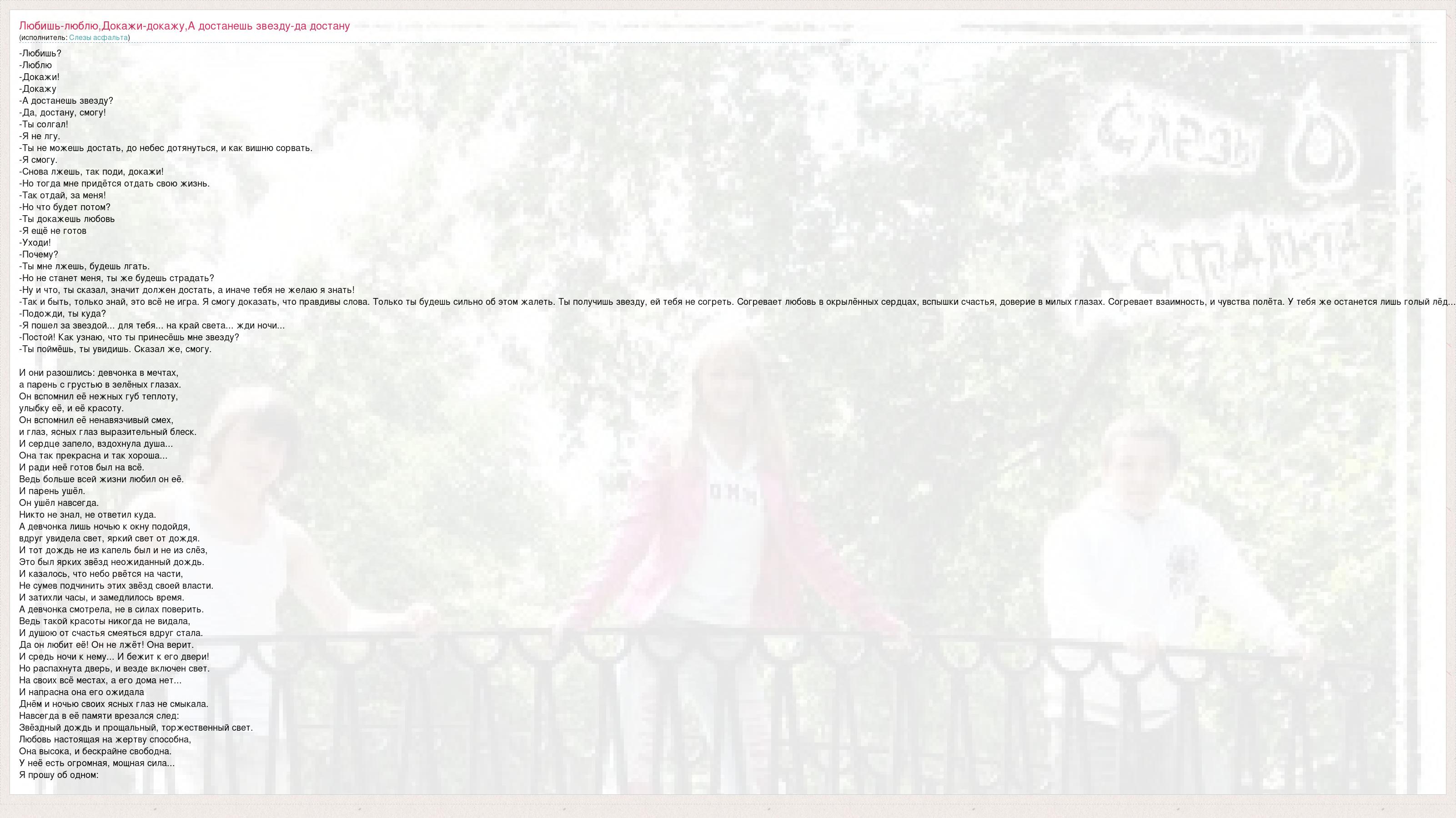 -Любишь? -Люблю -Докажи! -Докажу -А достанешь звезду? -Да, достану, смогу! -Ты солгал! -Я не лгу. -Ты не можешь достать, до небес дотянуться, и как вишню сорвать. -Я смогу. -Снова лжешь, так поди, докажи! -Но тогда мне придётся отдать свою жизнь. -Так отдай, за меня! -Но что будет потом? -Ты докажешь любовь -Я ещё не готов -Уходи! -Почему? -Ты мне лжешь, будешь лгать. -Но не станет меня, ты же будешь страдать? -Ну и что, ты сказал, значит должен достать, а иначе тебя не желаю я знать! -Так и быть, только знай, это всё не игра. Я смогу доказать, что правдивы слова. Только ты будешь сильно об этом жалеть. Ты получишь звезду, ей тебя не согреть. Согревает любовь в окрылённых сердцах, вспышки счастья, доверие в милых глазах. Согревает взаимность, и чувства полёта. У тебя же останется лишь голый лёд... -Подожди, ты куда? -Я пошел за звездой... для тебя... на край света... жди ночи... -Постой! Как узнаю, что ты принесёшь мне звезду? -Ты поймёшь, ты увидишь. Сказал же, смогу. И они разошлись: девчонка в мечтах, а парень с грустью в зелёных глазах. Он вспомнил её нежных губ теплоту, улыбку её, и её красоту. Он вспомнил её ненавязчивый смех, и глаз, ясных глаз выразительный блеск. И сердце запело, вздохнула душа... Она так прекрасна и так хороша... И ради неё готов был на всё. Ведь больше всей жизни любил он её. И парень ушёл. Он ушёл навсегда. Никто не знал, не ответил куда. А девчонка лишь ночью к окну подойдя, вдруг увидела свет, яркий свет от дождя. И тот дождь не из капель был и не из слёз, Это был ярких звёзд неожиданный дождь. И казалось, что небо рвётся на части, Не сумев подчинить этих звёзд своей власти. И затихли часы, и замедлилось время. А девчонка смотрела, не в силах поверить. Ведь такой красоты никогда не видала, И душою от счастья смеяться вдруг стала. Да он любит её! Он не лжёт! Она верит. И средь ночи к нему... И бежит к его двери! Но распахнута дверь, и везде включен свет. На своих всё местах, а его дома нет... И напрасна она его ожидала Днём и ночью своих ясных глаз не смыкала. Навсегда в её памяти врезался след: Звёздный дождь и прощальный, торжественный свет. Любовь настоящая на жертву способна, Она высока, и бескрайне свободна. У неё есть огромная, мощная сила... Я прошу об одном:
