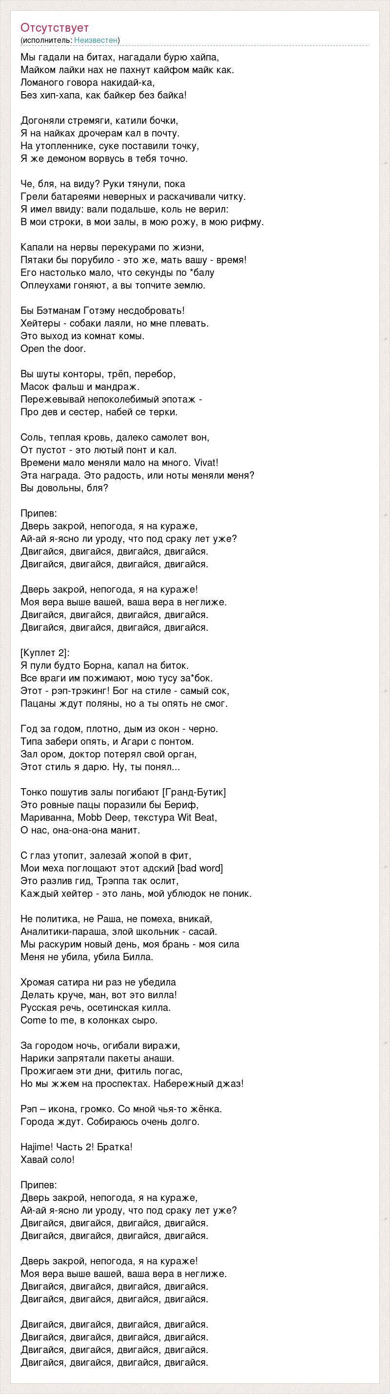 Мы гадали на битах, нагадали бурю хайпа, Майком лайки нах не пахнут кайфом майк как. Ломаного говора накидай-ка, Без хип-хапа, как байкер без байка! Догоняли стремяги, катили бочки, Я на найках дрочерам кал в почту. На утопленнике, суке поставили точку, Я же демоном ворвусь в тебя точно. Че, бля, на виду? Руки тянули, пока Грели батареями неверных и раскачивали читку. Я имел ввиду: вали подальше, коль не верил: В мои строки, в мои залы, в мою рожу, в мою рифму. Капали на нервы перекурами по жизни, Пятаки бы порубило - это же, мать вашу - время! Его настолько мало, что секунды по *балу Оплеухами гоняют, а вы топчите землю. Бы Бэтманам Готэму несдобровать! Хейтеры - собаки лаяли, но мне плевать. Это выход из комнат комы. Open the door. Вы шуты конторы, трёп, перебор, Масок фальш и мандраж. Пережевывай непоколебимый эпотаж - Про дев и сестер, набей се терки. Соль, теплая кровь, далеко самолет вон, От пустот - это лютый понт и кал. Времени мало меняли мало на много. Vivat! Эта награда. Это радость, или ноты меняли меня? Вы довольны, бля? Припев: Дверь закрой, непогода, я на кураже, Ай-ай я-ясно ли уроду, что под сраку лет уже? Двигайся, двигайся, двигайся, двигайся. Двигайся, двигайся, двигайся, двигайся. Дверь закрой, непогода, я на кураже! Моя вера выше вашей, ваша вера в неглиже. Двигайся, двигайся, двигайся, двигайся. Двигайся, двигайся, двигайся, двигайся. [Куплет 2]: Я пули будто Борна, капал на биток. Все враги им пожимают, мою тусу за*бок. Этот - рэп-трэкинг! Бог на стиле - самый сок, Пацаны ждут поляны, но а ты опять не смог. Год за годом, плотно, дым из окон - черно. Типа забери опять, и Агари с понтом. Зал ором, доктор потерял свой орган, Этот стиль я дарю. Ну, ты понял... Тонко пошутив залы погибают [Гранд-Бутик] Это ровные пацы поразили бы Бериф, Мариванна, Mobb Deep, текстура Wit Beat, О нас, она-она-она манит. С глаз утопит, залезай жопой в фит, Мои меха поглощают этот адский [bad word] Это разлив гид, Трэппа так ослит, Каждый хейтер - это лань, мой ублюдок не поник. Не политика, не Раша, не помеха, вникай, Аналитики-параша, злой школьник - сасай. Мы раскурим новый день, моя брань - моя сила Меня не убила, убила Билла. Хромая сатира ни раз не убедила Делать круче, ман, вот это вилла! Русская речь, осетинская килла. Come to me, в колонках сыро. За городом ночь, огибали виражи, Нарики запрятали пакеты анаши. Прожигаем эти дни, фитиль погас, Но мы жжем на проспектах. Набережный джаз! Рэп – икона, громко. Со мной чья-то жёнка. Города ждут. Собираюсь очень долго. Hajime! Часть 2! Братка! Хавай соло! Припев: Дверь закрой, непогода, я на кураже, Ай-ай я-ясно ли уроду, что под сраку лет уже? Двигайся, двигайся, двигайся, двигайся. Двигайся, двигайся, двигайся, двигайся. Дверь закрой, непогода, я на кураже! Моя вера выше вашей, ваша вера в неглиже. Двигайся, двигайся, двигайся, двигайся. Двигайся, двигайся, двигайся, двигайся. Двигайся, двигайся, двигайся, двигайся. Двигайся, двигайся, двигайся, двигайся. Двигайся, двигайся, двигайся, двигайся. Двигайся, двигайся, двигайся, двигайся.
