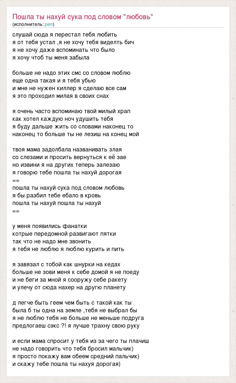 cлушай сюда я перестал тебя любить я от тебя устал ,я не хочу тебя виделть бич я не хочу даже вспоминать что было я хочу чтоб ты меня забыла больше не надо этих смс со словом люблю еще одна такая и я тебя убью и мне не нужен киллер я сделаю все сам я это проходил милая в своих снах я очень часто вспоминаю твой милый храп как хотел каждую ноч удушить тебя я буду дальше жить со словами наконец то наконец то больше ты не лезиш на конец мой твоя мама задолбала названивать злая со слезами и просить вернуться к её зае но извини я на других теперь залезаю я говорю тебе пошла ты нахуй дорогая == пошла ты нахуй сука под словом любовь я бы разбил тебе ебало в кровь пошла ты нахуй пошла ты нахуй == у меня появились фанатки котрые передомной развигают пятки так что не надо мне звонить я тебя не люблю я люблю курить и пить я завязал с тобой как шнурки на кедах больше не зови меня к себе домой я не поеду и не беги за мной я сооружу себе ракету и улечу от сюда нахер на другю планету д легче быть геем чем быть с такой как ты была б ты одна на земле ,тебя не выбрал бы я не люблю тебя не больше не меньше подруга предлогаеш сэкс ?! я лучше трахну свою руку и если мама спросит у тебя из за чего ты плачиш не надо говорить что тебя бросил мальчик) я просто покажу вам обеем средний пальчик) и скажу тебе пошла ты нахуя дорогая)