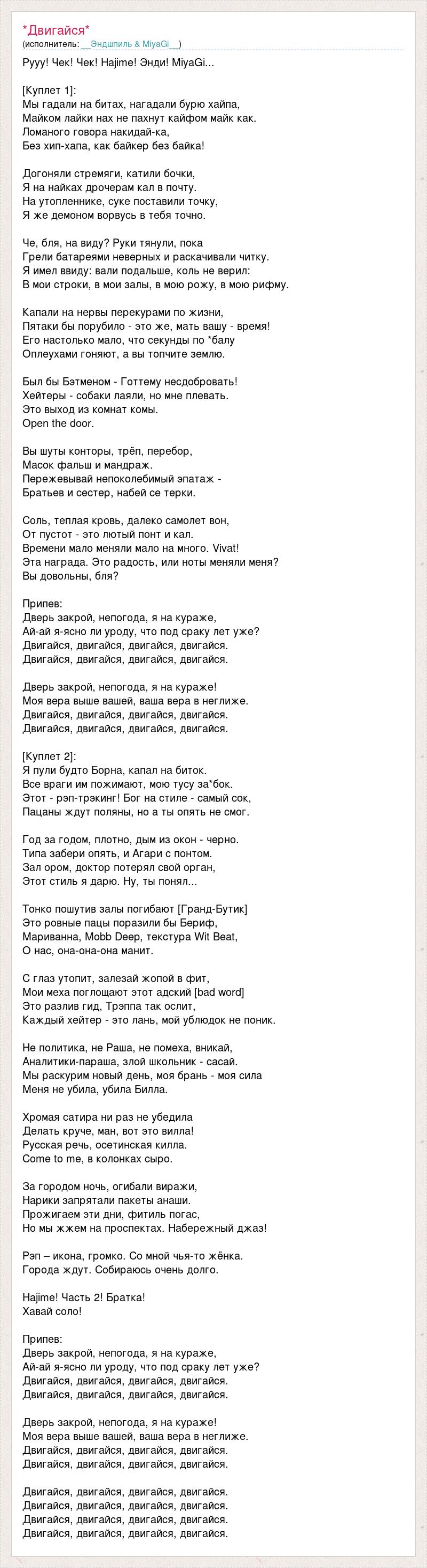 Рууу! Чек! Чек! Hajime! Энди! MiyaGi... [Куплет 1]: Мы гадали на битах, нагадали бурю хайпа, Майком лайки нах не пахнут кайфом майк как. Ломаного говора накидай-ка, Без хип-хапа, как байкер без байка! Догоняли стремяги, катили бочки, Я на найках дрочерам кал в почту. На утопленнике, суке поставили точку, Я же демоном ворвусь в тебя точно. Че, бля, на виду? Руки тянули, пока Грели батареями неверных и раскачивали читку. Я имел ввиду: вали подальше, коль не верил: В мои строки, в мои залы, в мою рожу, в мою рифму. Капали на нервы перекурами по жизни, Пятаки бы порубило - это же, мать вашу - время! Его настолько мало, что секунды по *балу Оплеухами гоняют, а вы топчите землю. Был бы Бэтменом - Готтему несдобровать! Хейтеры - собаки лаяли, но мне плевать. Это выход из комнат комы. Open the door. Вы шуты конторы, трёп, перебор, Масок фальш и мандраж. Пережевывай непоколебимый эпатаж - Братьев и сестер, набей се терки. Соль, теплая кровь, далеко самолет вон, От пустот - это лютый понт и кал. Времени мало меняли мало на много. Vivat! Эта награда. Это радость, или ноты меняли меня? Вы довольны, бля? Припев: Дверь закрой, непогода, я на кураже, Ай-ай я-ясно ли уроду, что под сраку лет уже? Двигайся, двигайся, двигайся, двигайся. Двигайся, двигайся, двигайся, двигайся. Дверь закрой, непогода, я на кураже! Моя вера выше вашей, ваша вера в неглиже. Двигайся, двигайся, двигайся, двигайся. Двигайся, двигайся, двигайся, двигайся. [Куплет 2]: Я пули будто Борна, капал на биток. Все враги им пожимают, мою тусу за*бок. Этот - рэп-трэкинг! Бог на стиле - самый сок, Пацаны ждут поляны, но а ты опять не смог. Год за годом, плотно, дым из окон - черно. Типа забери опять, и Агари с понтом. Зал ором, доктор потерял свой орган, Этот стиль я дарю. Ну, ты понял... Тонко пошутив залы погибают [Гранд-Бутик] Это ровные пацы поразили бы Бериф, Мариванна, Mobb Deep, текстура Wit Beat, О нас, она-она-она манит. С глаз утопит, залезай жопой в фит, Мои меха поглощают этот адский [bad word] Это разлив гид, Трэппа так ослит, Каждый хейтер - это лань, мой ублюдок не поник. Не политика, не Раша, не помеха, вникай, Аналитики-параша, злой школьник - сасай. Мы раскурим новый день, моя брань - моя сила Меня не убила, убила Билла. Хромая сатира ни раз не убедила Делать круче, ман, вот это вилла! Русская речь, осетинская килла. Come to me, в колонках сыро. За городом ночь, огибали виражи, Нарики запрятали пакеты анаши. Прожигаем эти дни, фитиль погас, Но мы жжем на проспектах. Набережный джаз! Рэп – икона, громко. Со мной чья-то жёнка. Города ждут. Собираюсь очень долго. Hajime! Часть 2! Братка! Хавай соло! Припев: Дверь закрой, непогода, я на кураже, Ай-ай я-ясно ли уроду, что под сраку лет уже? Двигайся, двигайся, двигайся, двигайся. Двигайся, двигайся, двигайся, двигайся. Дверь закрой, непогода, я на кураже! Моя вера выше вашей, ваша вера в неглиже. Двигайся, двигайся, двигайся, двигайся. Двигайся, двигайся, двигайся, двигайся. Двигайся, двигайся, двигайся, двигайся. Двигайся, двигайся, двигайся, двигайся. Двигайся, двигайся, двигайся, двигайся. Двигайся, двигайся, двигайся, двигайся.