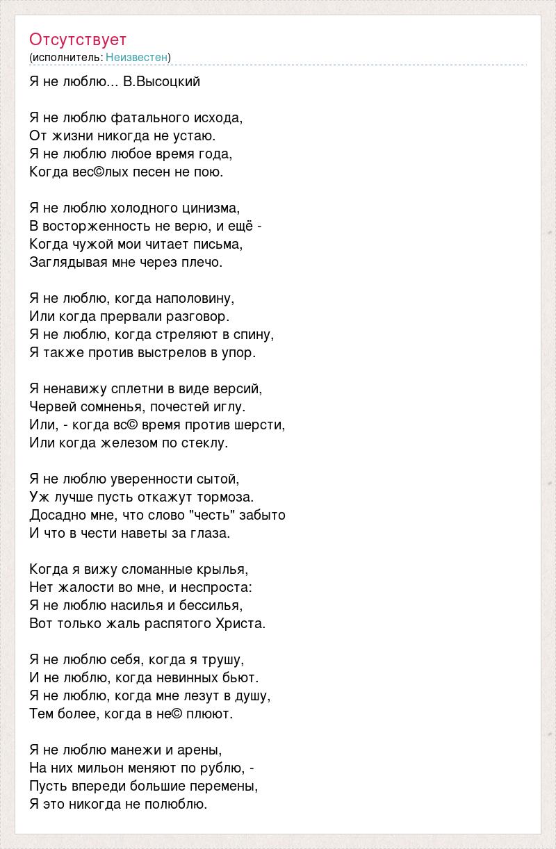 Я не люблю... В.Высоцкий Я не люблю фатального исхода, От жизни никогда не устаю. Я не люблю любое время года, Когда вес©лых песен не пою. Я не люблю холодного цинизма, В восторженность не верю, и ещё - Когда чужой мои читает письма, Заглядывая мне через плечо. Я не люблю, когда наполовину, Или когда прервали разговор. Я не люблю, когда стреляют в спину, Я также против выстрелов в упор. Я ненавижу сплетни в виде версий, Червей сомненья, почестей иглу. Или, - когда вс© время против шерсти, Или когда железом по стеклу. Я не люблю уверенности сытой, Уж лучше пусть откажут тормоза. Досадно мне, что слово "честь" забыто И что в чести наветы за глаза. Когда я вижу сломанные крылья, Нет жалости во мне, и неспроста: Я не люблю насилья и бессилья, Вот только жаль распятого Христа. Я не люблю себя, когда я трушу, И не люблю, когда невинных бьют. Я не люблю, когда мне лезут в душу, Тем более, когда в не© плюют. Я не люблю манежи и арены, На них мильон меняют по рублю, - Пусть впереди большие перемены, Я это никогда не полюблю.