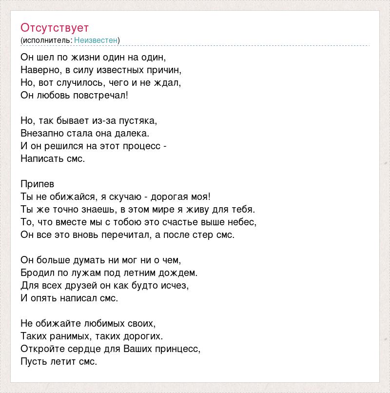 Он шел по жизни один на один, Наверно, в силу известных причин, Но, вот случилось, чего и не ждал, Он любовь повстречал! Но, так бывает из-за пустяка, Внезапно стала она далека. И он решился на этот процесс - Написать смс. Припев Ты не обижайся, я скучаю - дорогая моя! Ты же точно знаешь, в этом мире я живу для тебя. То, что вместе мы с тобою это счастье выше небес, Он все это вновь перечитал, а после стер смс. Он больше думать ни мог ни о чем, Бродил по лужам под летним дождем. Для всех друзей он как будто исчез, И опять написал смс. Не обижайте любимых своих, Таких ранимых, таких дорогих. Откройте сердце для Ваших принцесс, Пусть летит смс.