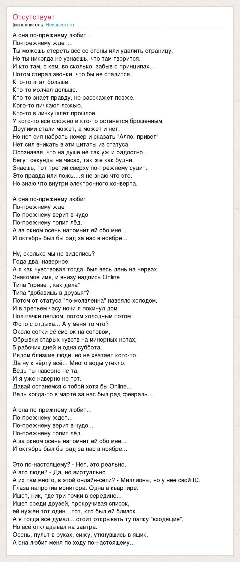 А она по-прежнему любит... По-прежнему ждет... Ты можешь стереть все со стены или удалить страницу, Но ты никогда не узнаешь, что там творится. И кто там, с кем, во сколько, забыв о принципах... Потом стирал звонки, что бы не спалится. Кто-то лгал больше. Кто-то молчал дольше. Кто-то знает правду, но расскажет позже. Кого-то пичкают ложью. Кто-то в личку шлёт прошлое. У кого-то всё сложно и кто-то останется брошенным. Другими стали может, а может и нет, Но нет сил набрать номер и сказать "Алло, привет" Нет сил вникать в эти цитаты из статуса Осознавая, что на душе не так уж и радостно... Бегут секунды на часах, так же как будни. Знаешь, тот третий сверху по-прежнему судит. Это правда или ложь....я не знаю что это. Но знаю что внутри электронного конверта. А она по-прежнему любит По-прежнему ждет По-прежнему верит в чудо По-прежнему топит лёд. А за окном осень напомнит ей обо мне... И октябрь был бы рад за нас в ноябре... Ну, сколько мы не виделись? Года два, наверное. А я как чувствовал тогда, был весь день на нервах. Знакомое имя, и внизу надпись Online Типа "привет, как дела" Типа "добавишь в друзья"? Потом от статуса "по-молвленна" навеяло холодом. И в третьем часу ночи я покинул дом Пол пачки пеплом, потом холодным потом Фото с отдыха... А у меня то что? Около сотки её смс-ок на сотовом, Обрывки старых чувств на минорных нотах, 5 рабочих дней и одна суббота, Рядом близкие люди, но не хватает кого-то. Да ну к чёрту всё... Много воды утекло. Ведь ты наверно не та, И я уже наверно не тот. Давай останемся с тобой хотя бы Online... Ведь когда-то в марте за нас был рад февраль… А она по-прежнему любит... По-прежнему ждет... По-прежнему верит в чудо... По-прежнему топит лёд... А за окном осень напомнит ей обо мне... И октябрь был бы рад за нас в ноябре... Это по-настоящему? - Нет, это реально. А это люди? - Да, но виртуально. А их там много, в этой онлайн-сети? - Миллионы, но у неё свой ID. Глаза напротив монитора. Одна в квартире. Ищет, ник, где три точки в середине... Ищет среди друзей, прокручивая список, ей нужен тот один…тот, кто был ей близок. А я тогда всё думал....стоит открывать ту папку "входящие", Но всё откладывал на завтра. Осень, пульт в руках, сижу, уткнувшись в ящик. А она любит меня по ходу по-настоящему...