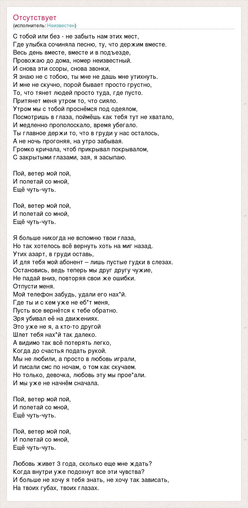 С тобой или без - не забыть нам этих мест, Где улыбка сочиняла песню, ту, что держим вместе. Весь день вместе, вместе и в подъезде, Провожаю до дома, номер неизвестный. И снова эти ссоры, снова звонки, Я знаю не с тобою, ты мне не дашь мне утихнуть. И мне не скучно, порой бывает просто грустно, То, что тянет людей просто туда, где пусто. Притянет меня утром то, что сияло. Утром мы с тобой проснёмся под одеялом, Посмотришь в глаза, поймёшь как тебя тут не хватало, И медленно прополоскало, время убегало. Ты главное держи то, что в груди у нас осталось, А не ночь прогоняя, на утро забывая. Громко кричала, чтоб прикрывал покрывалом, С закрытыми глазами, зая, я засыпаю. Пой, ветер мой пой, И полетай со мной, Ещё чуть-чуть. Пой, ветер мой пой, И полетай со мной, Ещё чуть-чуть. Я больше никогда не вспомню твои глаза, Но так хотелось всё вернуть хоть на миг назад. Утих азарт, в груди оставь, И для тебя мой абонент – лишь пустые гудки в слезах. Остановись, ведь теперь мы друг другу чужие, Не падай вниз, повторяя свои же ошибки. Отпусти меня. Мой телефон забудь, удали его нах*й. Где ты и с кем уже не еб*т меня, Пусть все вернётся к тебе обратно. Зря убивал её на движениях. Это уже не я, а кто-то другой Шлет тебя нах*й так далеко. А видимо так всё потерять легко, Когда до счастья подать рукой. Мы не любили, а просто в любовь играли, И писали смс по ночам, о том как скучаем. Но только, девочка, любовь эту мы прое*али. И мы уже не начнём сначала. Пой, ветер мой пой, И полетай со мной, Ещё чуть-чуть. Пой, ветер мой пой, И полетай со мной, Ещё чуть-чуть. Любовь живет 3 года, сколько еще мне ждать? Когда внутри уже подохнут все эти чувства? И больше не хочу я тебя знать, не хочу так зависать, На твоих губах, твоих глазах.