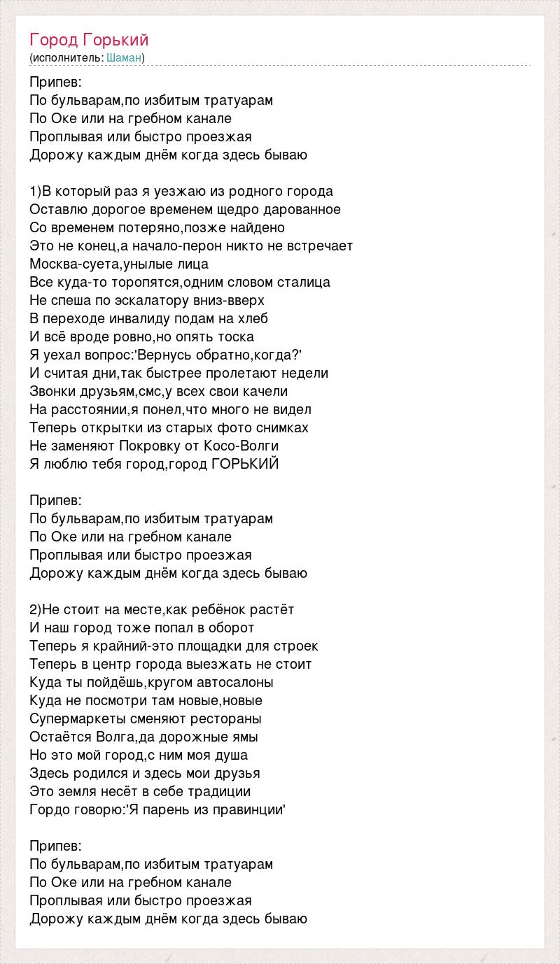 Припев: По бульварам,по избитым тратуарам По Оке или на гребном канале Проплывая или быстро проезжая Дорожу каждым днём когда здесь бываю 1)В который раз я уезжаю из родного города Оставлю дорогое временем щедро дарованное Со временем потеряно,позже найдено Это не конец,а начало-перон никто не встречает Москва-суета,унылые лица Все куда-то торопятся,одним словом сталица Не спеша по эскалатору вниз-вверх В переходе инвалиду подам на хлеб И всё вроде ровно,но опять тоска Я уехал вопрос:'Вернусь обратно,когда?' И считая дни,так быстрее пролетают недели Звонки друзьям,смс,у всех свои качели На расстоянии,я понел,что много не видел Теперь открытки из старых фото снимках Не заменяют Покровку от Косо-Волги Я люблю тебя город,город ГОРЬКИЙ Припев: По бульварам,по избитым тратуарам По Оке или на гребном канале Проплывая или быстро проезжая Дорожу каждым днём когда здесь бываю 2)Не стоит на месте,как ребёнок растёт И наш город тоже попал в оборот Теперь я крайний-это площадки для строек Теперь в центр города выезжать не стоит Куда ты пойдёшь,кругом автосалоны Куда не посмотри там новые,новые Супермаркеты сменяют рестораны Остаётся Волга,да дорожные ямы Но это мой город,с ним моя душа Здесь родился и здесь мои друзья Это земля несёт в себе традиции Гордо говорю:'Я парень из правинции' Припев: По бульварам,по избитым тратуарам По Оке или на гребном канале Проплывая или быстро проезжая Дорожу каждым днём когда здесь бываю