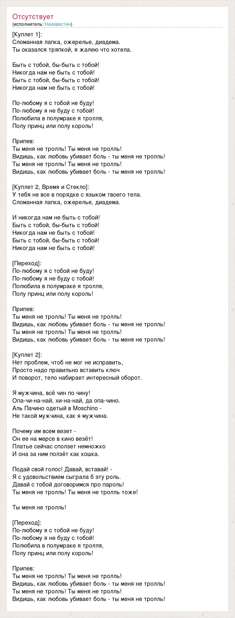 [Куплет 1]: Сломанная лапка, ожерелье, диадема. Ты оказался тряпкой, я жалею что хотела. Быть с тобой, бы-быть с тобой! Никогда нам не быть с тобой! Быть с тобой, бы-быть с тобой! Никогда нам не быть с тобой! По-любому я с тобой не буду! По-любому я не буду с тобой! Полюбила в полумраке я тролля, Полу принц или полу король! Припев: Ты меня не тролль! Ты меня не тролль! Видишь, как любовь убивает боль - ты меня не тролль! Ты меня не тролль! Ты меня не тролль! Видишь, как любовь убивает боль - ты меня не тролль! [Куплет 2, Время и Стекло]: У тебя не все в порядке с языком твоего тела. Сломанная лапка, ожерелье, диадема. И никогда нам не быть с тобой! Быть с тобой, бы-быть с тобой! Никогда нам не быть с тобой! Быть с тобой, бы-быть с тобой! Никогда нам не быть с тобой! [Переход]: По-любому я с тобой не буду! По-любому я не буду с тобой! Полюбила в полумраке я тролля, Полу принц или полу король! Припев: Ты меня не тролль! Ты меня не тролль! Видишь, как любовь убивает боль - ты меня не тролль! Ты меня не тролль! Ты меня не тролль! Видишь, как любовь убивает боль - ты меня не тролль! [Куплет 2]: Нет проблем, чтоб не мог не исправить, Просто надо правильно вставить ключ И поворот, тело набирает интересный оборот. Я мужчина, всё чин по чину! Опа-чи-на-най, xи-на-най, да опа-чино. Аль Пачино одетый в Moschino - Не такой мужчина, как я мужчина. Почему им всем везет - Он ее на мерсе в кино везёт! Платье сейчас сползет немножко И она за ним ползёт как кошка. Подай свой голос! Давай, вставай! - Я с удовольствием сыграла б эту роль. Давай с тобой договоримся про пароль! Ты меня не тролль! Ты меня не тролль тоже! Ты меня не тролль! [Переход]: По-любому я с тобой не буду! По-любому я не буду с тобой! Полюбила в полумраке я тролля, Полу принц или полу король! Припев: Ты меня не тролль! Ты меня не тролль! Видишь, как любовь убивает боль - ты меня не тролль! Ты меня не тролль! Ты меня не тролль! Видишь, как любовь убивает боль - ты меня не тролль!