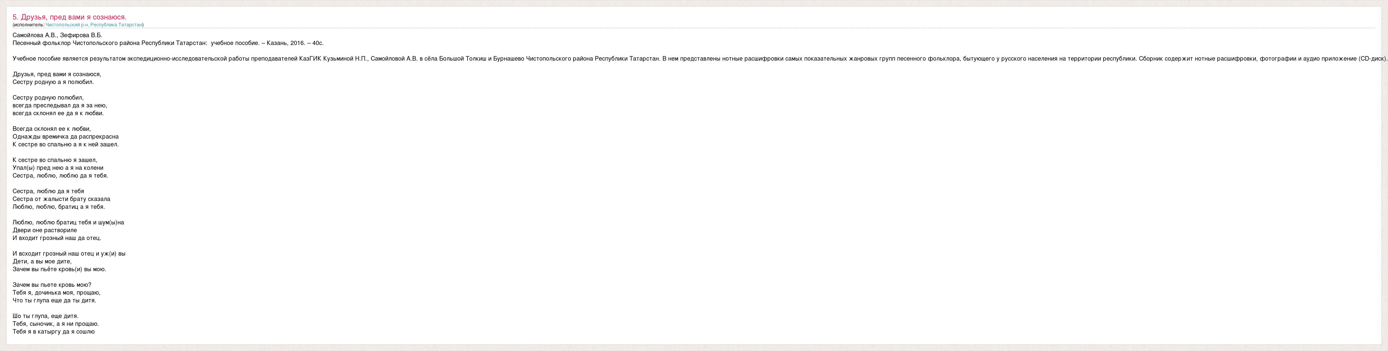 Самойлова А.В., Зефирова В.Б. Песенный фольклор Чистопольского района Республики Татарстан: учебное пособие. – Казань, 2016. – 40с. Учебное пособие является результатом экспедиционно-исследовательской работы преподавателей КазГИК Кузьминой Н.П., Самойловой А.В. в сёла Большой Толкиш и Бурнашево Чистопольского района Республики Татарстан. В нем представлены нотные расшифровки самых показательных жанровых групп песенного фольклора, бытующего у русского населения на территории республики. Сборник содержит нотные расшифровки, фотографии и аудио приложение (CD-диск). Друзья, пред вами я сознаюся, Сестру родную а я полюбил. Сестру родную полюбил, всегда преследывал да я за нею, всегда склонял ее да я к любви. Всегда склонял ее к любви, Однажды времичка да распрекрасна К сестре во спальню а я к ней зашел. К сестре во спальню я зашел, Упал(ы) пред нею а я на колени Сестра, люблю, люблю да я тебя. Сестра, люблю да я тебя Сестра от жалысти брату сказала Люблю, люблю, братиц а я тебя. Люблю, люблю братиц тебя и шум(ы)на Двери оне раствориле И входит грозный наш да отец. И всходит грозный наш отец и уж(и) вы Дети, а вы мое дите, Зачем вы пьёте кровь(и) вы мою. Зачем вы пьете кровь мою? Тебя я, дочинька моя, прощаю, Что ты глупа еще да ты дитя. Шо ты глупа, еще дитя. Тебя, сыночик, а я ни прощаю. Тебя я в катыргу да я сошлю