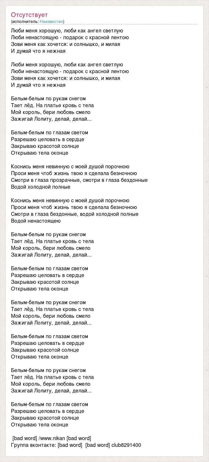 Люби меня хорошую, люби как ангел светлую Люби ненастоящую - подарок с красной лентою Зови меня как хочется: и солнышко, и милая И думай что я нежная Люби меня хорошую, люби как ангел светлую Люби ненастоящую - подарок с красной лентою Зови меня как хочется: и солнышко, и милая И думай что я нежная Белым-белым по рукам снегом Тает лёд. На платье кровь с тела Мой король, бери любовь смело Зажигай Лолиту, делай, делай... Белым-белым по глазам светом Разрешаю целовать в сердце Закрываю красотой солнце Открываю тела оконце Коснись меня невинную с моей душой порочною Проси меня чтоб жизнь твою я сделала безночною Смотри в глаза прозрачные, смотри в глаза бездонные Водой холодной полные Коснись меня невинную с моей душой порочною Проси меня чтоб жизнь твою я сделала безночною Смотри в глаза бездонные, водой холодной полные Водой ненастоящею Белым-белым по рукам снегом Тает лёд. На платье кровь с тела Мой король, бери любовь смело Зажигай Лолиту, делай, делай... Белым-белым по глазам светом Разрешаю целовать в сердце Закрываю красотой солнце Открываю тела оконце Белым-белым по рукам снегом Тает лёд. На платье кровь с тела Мой король, бери любовь смело Зажигай Лолиту, делай, делай... Белым-белым по глазам светом Разрешаю целовать в сердце Закрываю красотой солнце Открываю тела оконце Белым-белым по рукам снегом Тает лёд. На платье кровь с тела Мой король, бери любовь смело Зажигай Лолиту, делай, делай... Белым-белым по глазам светом Разрешаю целовать в сердце Закрываю красотой солнце Открываю тела оконце [bad word] /www.nikan [bad word] Группа вконтакте: [bad word] [bad word] club8291400