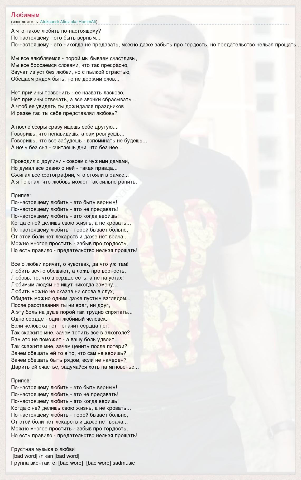 А что такое любить по-настоящему? По-настоящему - это быть верным... По-настоящему - это никогда не предавать, можно даже забыть про гордость, но предательство нельзя прощать... Мы все влюбляемся - порой мы бываем счастливы, Мы все бросаемся словами, что так прекрасно, Звучат из уст без любви, но с пылкой страстью, Обещаем рядом быть, но не держим слов... Нет причины позвонить - ее назвать ласково, Нет причины отвечать, а все звонки сбрасывать... А чтоб ее увидеть ты дожидался праздников И разве так ты себе представлял любовь? А после ссоры сразу ищешь себе другую... Говоришь, что ненавидишь, а сам ревнуешь... Говоришь, что все забудешь - вспоминать не будешь... А ночь без сна - считаешь дни, что без нее... Проводил с другими - совсем с чужими дамами, Но думал все равно о ней - такая правда... Сжигал все фотографии, что стояли в рамке... А я не знал, что любовь может так сильно ранить. Припев: По-настоящему любить - это быть верным! По-настоящему любить - это не предавать! По-настоящему любить - это когда веришь! Когда с ней делишь свою жизнь, а не кровать... По-настоящему любить - порой бывает больно, От этой боли нет лекарств и даже нет врача... Можно многое простить - забыв про гордость, Но есть правило - предательство нельзя прощать! Все о любви кричат, о чувствах, да что уж там! Любить вечно обещают, а ложь про верность, Любовь, то, что в сердце есть, а не на устах! Любимым людям не ищут никогда замену... Любить можно не сказав ни слова в слух, Обидеть можно одним даже пустым взглядом... После расставания ты ни враг, ни друг, А эту боль на душе порой так трудно спрятать... Одно сердце - один любимый человек. Если человека нет - значит сердца нет. Так скажите мне, зачем топить все в алкоголе? Вам это не поможет - а вашу боль удвоит... Так скажите мне, зачем ценить после потери? Зачем обещать ей то в то, что сам не веришь? Зачем обещать быть рядом, если не намерен? Дарить ей счастье, задумайся хоть на мгновенье... Припев: По-настоящему любить - это быть верным! По-настоящему любить - это не предавать! По-настоящему любить - это когда веришь! Когда с ней делишь свою жизнь, а не кровать... По-настоящему любить - порой бывает больно, От этой боли нет лекарств и даже нет врача... Можно многое простить - забыв про гордость, Но есть правило - предательство нельзя прощать! Грустная музыка о любви [bad word] /nikan [bad word] Группа вконтакте: [bad word] [bad word] sadmusic