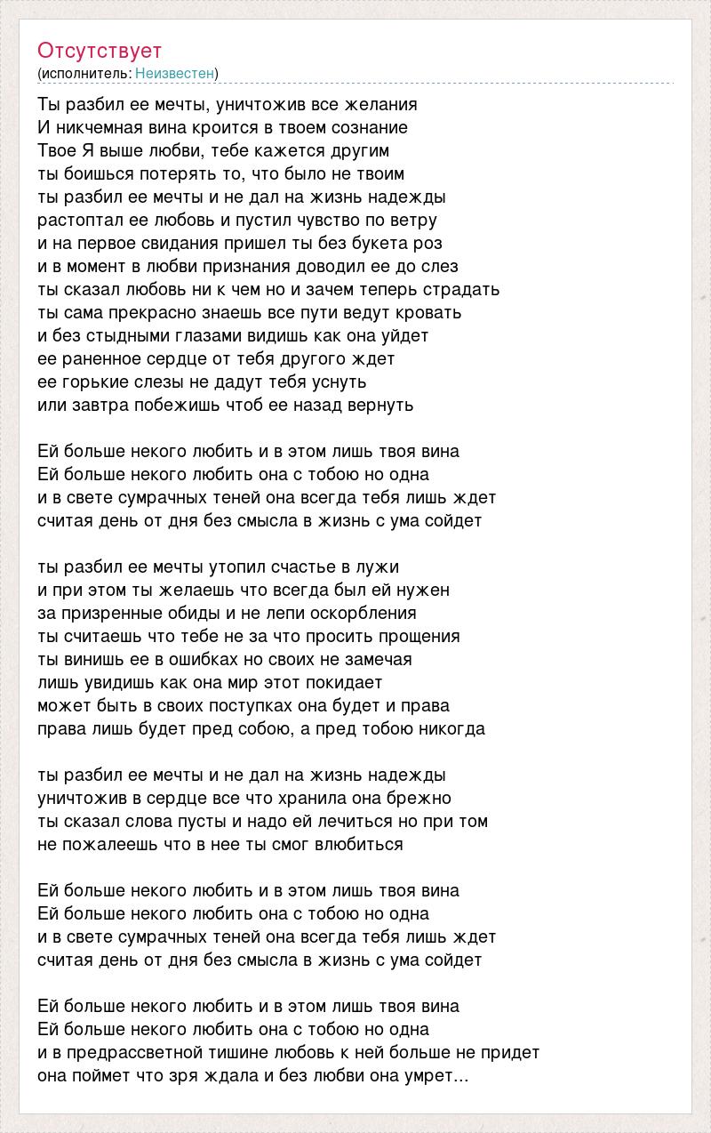 Ты разбил ее мечты, уничтожив все желания И никчемная вина кроится в твоем сознание Твое Я выше любви, тебе кажется другим ты боишься потерять то, что было не твоим ты разбил ее мечты и не дал на жизнь надежды растоптал ее любовь и пустил чувство по ветру и на первое свидания пришел ты без букета роз и в момент в любви признания доводил ее до слез ты сказал любовь ни к чем но и зачем теперь страдать ты сама прекрасно знаешь все пути ведут кровать и без стыдными глазами видишь как она уйдет ее раненное сердце от тебя другого ждет ее горькие слезы не дадут тебя уснуть или завтра побежишь чтоб ее назад вернуть Ей больше некого любить и в этом лишь твоя вина Ей больше некого любить она с тобою но одна и в свете сумрачных теней она всегда тебя лишь ждет считая день от дня без смысла в жизнь с ума сойдет ты разбил ее мечты утопил счастье в лужи и при этом ты желаешь что всегда был ей нужен за призренные обиды и не лепи оскорбления ты считаешь что тебе не за что просить прощения ты винишь ее в ошибках но своих не замечая лишь увидишь как она мир этот покидает может быть в своих поступках она будет и права права лишь будет пред собою, а пред тобою никогда ты разбил ее мечты и не дал на жизнь надежды уничтожив в сердце все что хранила она брежно ты сказал слова пусты и надо ей лечиться но при том не пожалеешь что в нее ты смог влюбиться Ей больше некого любить и в этом лишь твоя вина Ей больше некого любить она с тобою но одна и в свете сумрачных теней она всегда тебя лишь ждет считая день от дня без смысла в жизнь с ума сойдет Ей больше некого любить и в этом лишь твоя вина Ей больше некого любить она с тобою но одна и в предрассветной тишине любовь к ней больше не придет она поймет что зря ждала и без любви она умрет...
