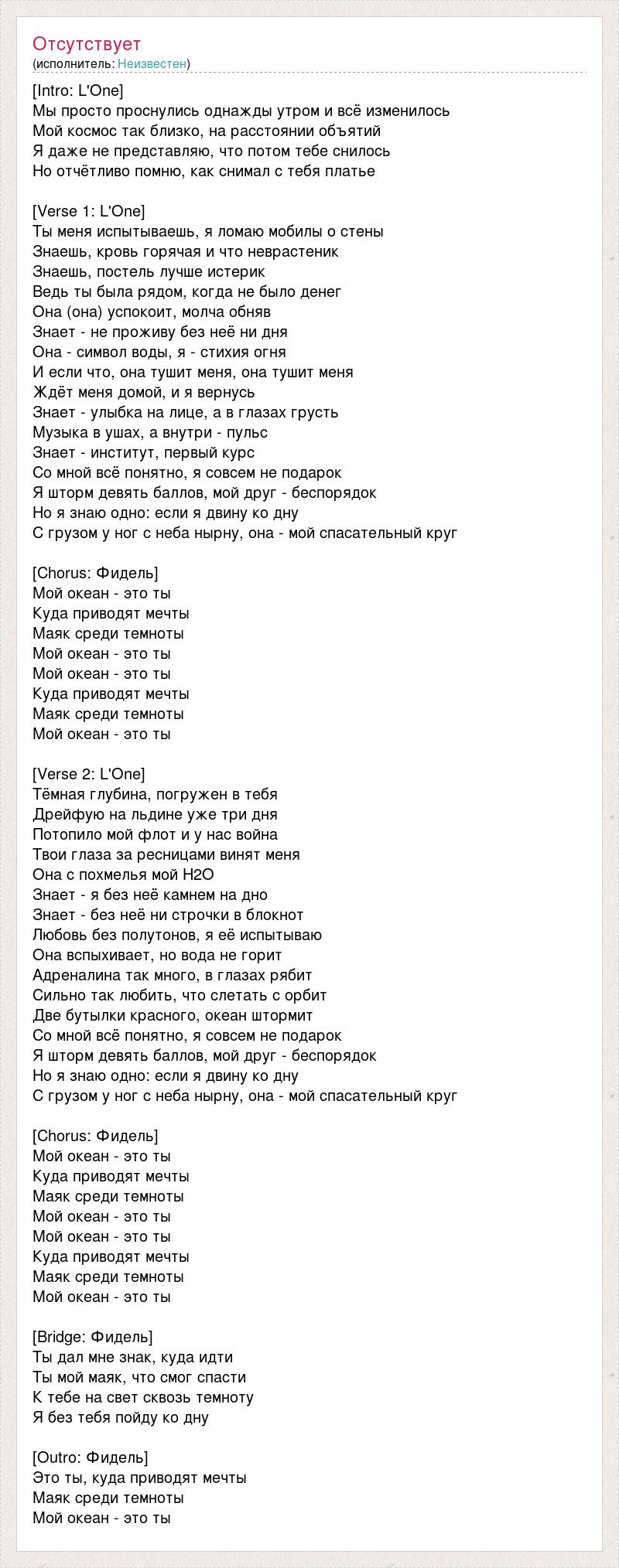 [Intro: L'One] Мы просто проснулись однажды утром и всё изменилось Мой космос так близко, на расстоянии объятий Я даже не представляю, что потом тебе снилось Но отчётливо помню, как снимал с тебя платье [Verse 1: L'One] Ты меня испытываешь, я ломаю мобилы о стены Знаешь, кровь горячая и что неврастеник Знаешь, постель лучше истерик Ведь ты была рядом, когда не было денег Она (она) успокоит, молча обняв Знает - не проживу без неё ни дня Она - символ воды, я - стихия огня И если что, она тушит меня, она тушит меня Ждёт меня домой, и я вернусь Знает - улыбка на лице, а в глазах грусть Музыка в ушах, а внутри - пульс Знает - институт, первый курс Со мной всё понятно, я совсем не подарок Я шторм девять баллов, мой друг - беспорядок Но я знаю одно: если я двину ко дну С грузом у ног с неба нырну, она - мой спасательный круг [Chorus: Фидель] Мой океан - это ты Куда приводят мечты Маяк среди темноты Мой океан - это ты Мой океан - это ты Куда приводят мечты Маяк среди темноты Мой океан - это ты [Verse 2: L'One] Тёмная глубина, погружен в тебя Дрейфую на льдине уже три дня Потопило мой флот и у нас война Твои глаза за ресницами винят меня Она с похмелья мой H2O Знает - я без неё камнем на дно Знает - без неё ни строчки в блокнот Любовь без полутонов, я её испытываю Она вспыхивает, но вода не горит Адреналина так много, в глазах рябит Сильно так любить, что слетать с орбит Две бутылки красного, океан штормит Со мной всё понятно, я совсем не подарок Я шторм девять баллов, мой друг - беспорядок Но я знаю одно: если я двину ко дну С грузом у ног с неба нырну, она - мой спасательный круг [Chorus: Фидель] Мой океан - это ты Куда приводят мечты Маяк среди темноты Мой океан - это ты Мой океан - это ты Куда приводят мечты Маяк среди темноты Мой океан - это ты [Bridge: Фидель] Ты дал мне знак, куда идти Ты мой маяк, что смог спасти К тебе на свет сквозь темноту Я без тебя пойду ко дну [Outro: Фидель] Это ты, куда приводят мечты Маяк среди темноты Мой океан - это ты
