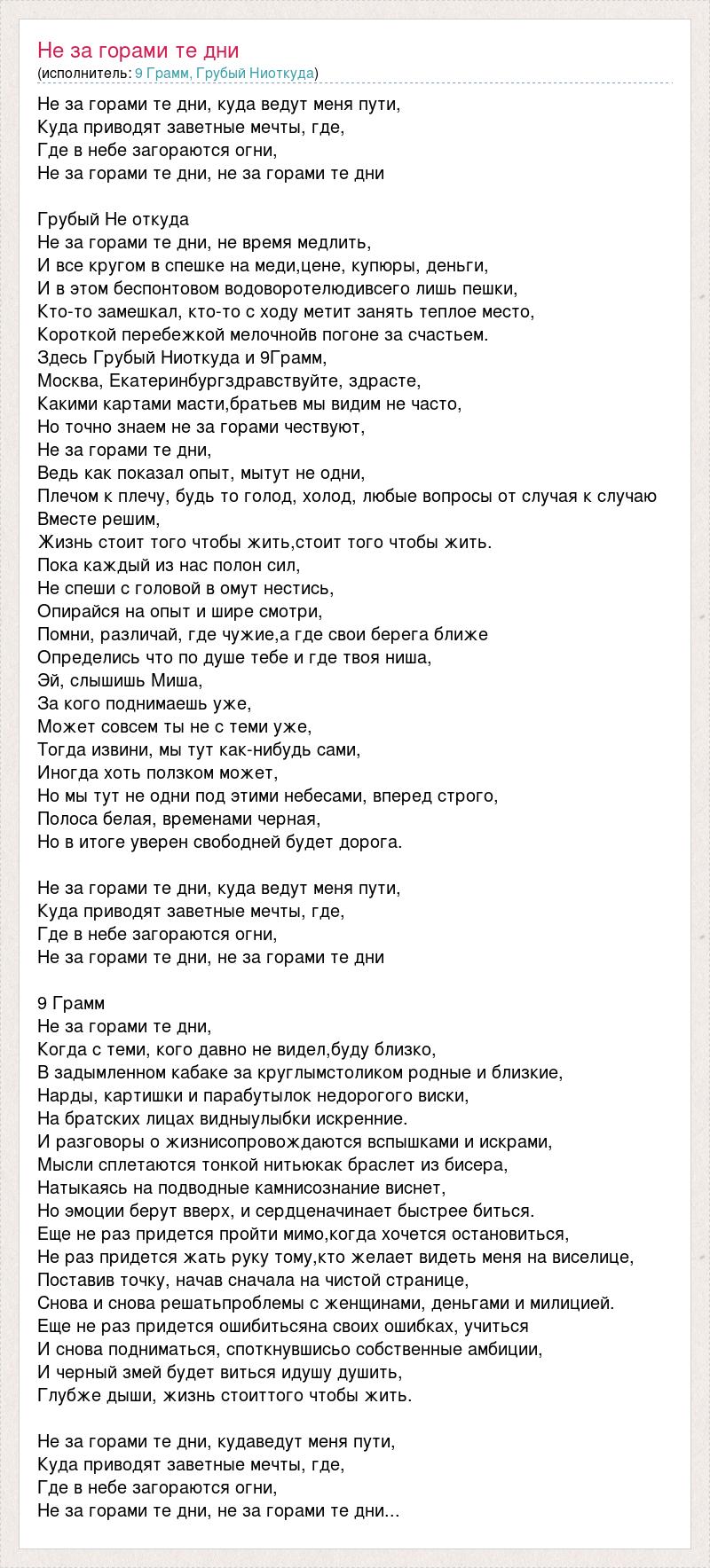 Не за горами те дни, куда ведут меня пути, Куда приводят заветные мечты, где, Где в небе загораются огни, Не за горами те дни, не за горами те дни Грубый Не откуда Не за горами те дни, не время медлить, И все кругом в спешке на меди,цене, купюры, деньги, И в этом беспонтовом водоворотелюдивсего лишь пешки, Кто-то замешкал, кто-то с ходу метит занять теплое место, Короткой перебежкой мелочнойв погоне за счастьем. Здесь Грубый Ниоткуда и 9Грамм, Москва, Екатеринбургздравствуйте, здрасте, Какими картами масти,братьев мы видим не часто, Но точно знаем не за горами чествуют, Не за горами те дни, Ведь как показал опыт, мытут не одни, Плечом к плечу, будь то голод, холод, любые вопросы от случая к случаю Вместе решим, Жизнь стоит того чтобы жить,стоит того чтобы жить. Пока каждый из нас полон сил, Не спеши с головой в омут нестись, Опирайся на опыт и шире смотри, Помни, различай, где чужие,а где свои берега ближе Определись что по душе тебе и где твоя ниша, Эй, слышишь Миша, За кого поднимаешь уже, Может совсем ты не с теми уже, Тогда извини, мы тут как-нибудь сами, Иногда хоть ползком может, Но мы тут не одни под этими небесами, вперед строго, Полоса белая, временами черная, Но в итоге уверен свободней будет дорога. Не за горами те дни, куда ведут меня пути, Куда приводят заветные мечты, где, Где в небе загораются огни, Не за горами те дни, не за горами те дни 9 Грамм Не за горами те дни, Когда с теми, кого давно не видел,буду близко, В задымленном кабаке за круглымстоликом родные и близкие, Нарды, картишки и парабутылок недорогого виски, На братских лицах видныулыбки искренние. И разговоры о жизнисопровождаются вспышками и искрами, Мысли сплетаются тонкой нитьюкак браслет из бисера, Натыкаясь на подводные камнисознание виснет, Но эмоции берут вверх, и сердценачинает быстрее биться. Еще не раз придется пройти мимо,когда хочется остановиться, Не раз придется жать руку тому,кто желает видеть меня на виселице, Поставив точку, начав сначала на чистой странице, Снова и снова решатьпроблемы с женщинами, деньгами и милицией. Еще не раз придется ошибитьсяна своих ошибках, учиться И снова подниматься, споткнувшисьо собственные амбиции, И черный змей будет виться идушу душить, Глубже дыши, жизнь стоиттого чтобы жить. Не за горами те дни, кудаведут меня пути, Куда приводят заветные мечты, где, Где в небе загораются огни, Не за горами те дни, не за горами те дни...