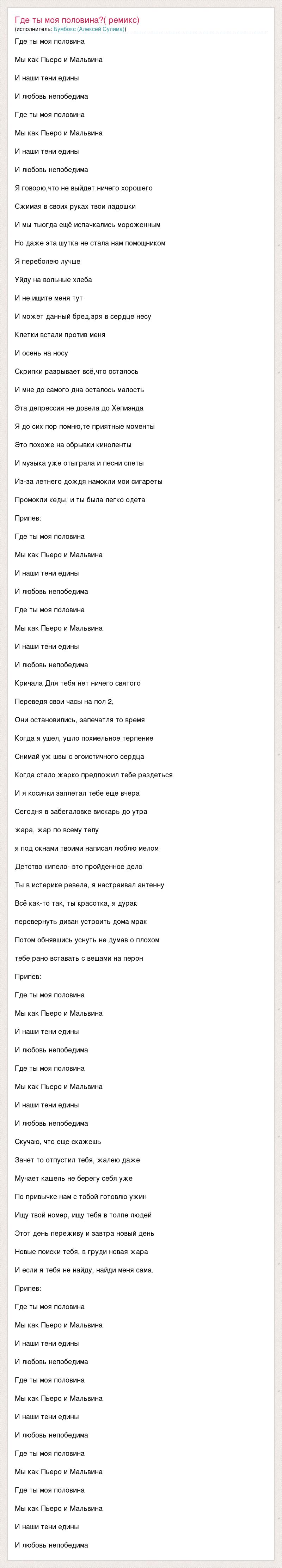 Где ты моя половина Мы как Пьеро и Мальвина И наши тени едины И любовь непобедима Где ты моя половина Мы как Пьеро и Мальвина И наши тени едины И любовь непобедима Я говорю,что не выйдет ничего хорошего Сжимая в своих руках твои ладошки И мы тыогда ещё испачкались мороженным Но даже эта шутка не стала нам помощником Я переболею лучше Уйду на вольные хлеба И не ищите меня тут И может данный бред,зря в сердце несу Клетки встали против меня И осень на носу Скрипки разрывает всё,что осталось И мне до самого дна осталось малость Эта депрессия не довела до Хепиэнда Я до сих пор помню,те приятные моменты Это похоже на обрывки киноленты И музыка уже отыграла и песни спеты Из-за летнего дождя намокли мои сигареты Промокли кеды, и ты была легко одета Припев: Где ты моя половина Мы как Пьеро и Мальвина И наши тени едины И любовь непобедима Где ты моя половина Мы как Пьеро и Мальвина И наши тени едины И любовь непобедима Кричала Для тебя нет ничего святого Переведя свои часы на пол 2, Они остановились, запечатля то время Когда я ушел, ушло похмельное терпение Снимай уж швы с эгоистичного сердца Когда стало жарко предложил тебе раздеться И я косички заплетал тебе еще вчера Сегодня в забегаловке вискарь до утра жара, жар по всему телу я под окнами твоими написал люблю мелом Детство кипело- это пройденное дело Ты в истерике ревела, я настраивал антенну Всё как-то так, ты красотка, я дурак перевернуть диван устроить дома мрак Потом обнявшись уснуть не думав о плохом тебе рано вставать с вещами на перон Припев: Где ты моя половина Мы как Пьеро и Мальвина И наши тени едины И любовь непобедима Где ты моя половина Мы как Пьеро и Мальвина И наши тени едины И любовь непобедима Скучаю, что еще скажешь Зачет то отпустил тебя, жалею даже Мучает кашель не берегу себя уже По привычке нам с тобой готовлю ужин Ищу твой номер, ищу тебя в толпе людей Этот день переживу и завтра новый день Новые поиски тебя, в груди новая жара И если я тебя не найду, найди меня сама. Припев: Где ты моя половина Мы как Пьеро и Мальвина И наши тени едины И любовь непобедима Где ты моя половина Мы как Пьеро и Мальвина И наши тени едины И любовь непобедима Где ты моя половина Мы как Пьеро и Мальвина Где ты моя половина Мы как Пьеро и Мальвина И наши тени едины И любовь непобедима