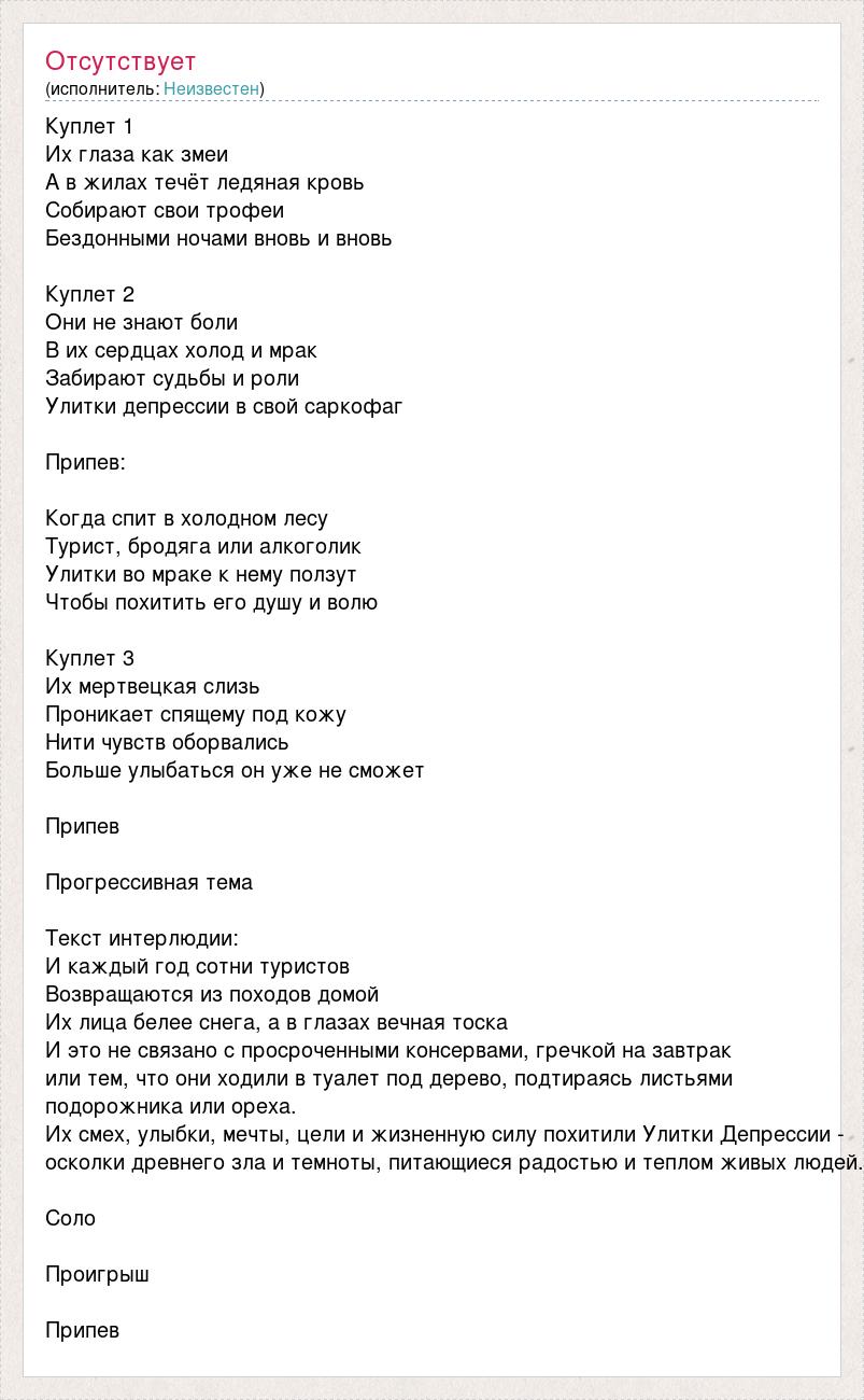 Куплет 1 Их глаза как змеи А в жилах течёт ледяная кровь Собирают свои трофеи Бездонными ночами вновь и вновь Куплет 2 Они не знают боли В их сердцах холод и мрак Забирают судьбы и роли Улитки депрессии в свой саркофаг Припев: Когда спит в холодном лесу Турист, бродяга или алкоголик Улитки во мраке к нему ползут Чтобы похитить его душу и волю Куплет 3 Их мертвецкая слизь Проникает спящему под кожу Нити чувств оборвались Больше улыбаться он уже не сможет Припев Прогрессивная тема Текст интерлюдии: И каждый год сотни туристов Возвращаются из походов домой Их лица белее снега, а в глазах вечная тоска И это не связано с просроченными консервами, гречкой на завтрак или тем, что они ходили в туалет под дерево, подтираясь листьями подорожника или ореха. Их смех, улыбки, мечты, цели и жизненную силу похитили Улитки Депрессии - осколки древнего зла и темноты, питающиеся радостью и теплом живых людей. Соло Проигрыш Припев