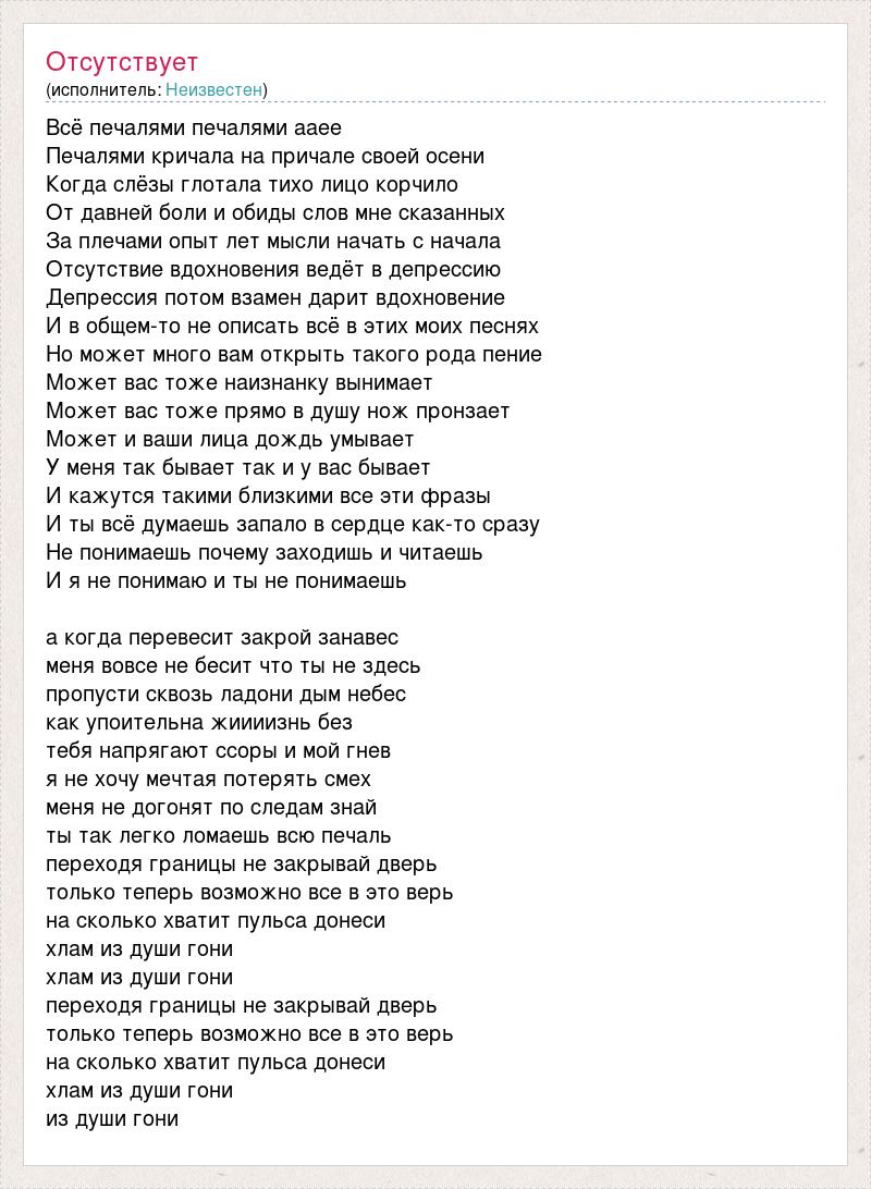 Всё печалями печалями ааее Печалями кричала на причале своей осени Когда слёзы глотала тихо лицо корчило От давней боли и обиды слов мне сказанных За плечами опыт лет мысли начать с начала Отсутствие вдохновения ведёт в депрессию Депрессия потом взамен дарит вдохновение И в общем-то не описать всё в этих моих песнях Но может много вам открыть такого рода пение Может вас тоже наизнанку вынимает Может вас тоже прямо в душу нож пронзает Может и ваши лица дождь умывает У меня так бывает так и у вас бывает И кажутся такими близкими все эти фразы И ты всё думаешь запало в сердце как-то сразу Не понимаешь почему заходишь и читаешь И я не понимаю и ты не понимаешь а когда перевесит закрой занавес меня вовсе не бесит что ты не здесь пропусти сквозь ладони дым небес как упоительна жиииизнь без тебя напрягают ссоры и мой гнев я не хочу мечтая потерять смех меня не догонят по следам знай ты так легко ломаешь всю печаль переходя границы не закрывай дверь только теперь возможно все в это верь на сколько хватит пульса донеси хлам из души гони хлам из души гони переходя границы не закрывай дверь только теперь возможно все в это верь на сколько хватит пульса донеси хлам из души гони из души гони
