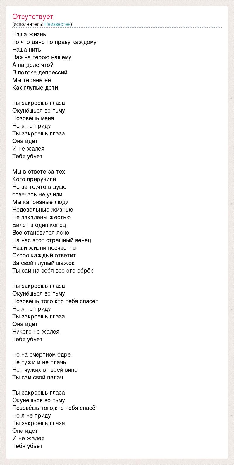 Наша жизнь То что дано по праву каждому Наша нить Важна герою нашему А на деле что? В потоке депрессий Мы теряем её Как глупые дети Ты закроешь глаза Окунёшься во тьму Позовёшь меня Но я не приду Ты закроешь глаза Она идет И не жалея Тебя убьет Мы в ответе за тех Кого приручили Но за то,что в душе отвечать не учили Мы капризные люди Недовольные жизнью Не закалены жестью Билет в один конец Все становится ясно На нас этот страшный венец Наши жизни несчастны Скоро каждый ответит За свой глупый шажок Ты сам на себя все это обрёк Ты закроешь глаза Окунёшься во тьму Позовёшь того,кто тебя спасёт Но я не приду Ты закроешь глаза Она идет Никого не жалея Тебя убьет Но на смертном одре Не тужи и не плачь Нет чужих в твоей вине Ты сам свой палач Ты закроешь глаза Окунёшься во тьму Позовёшь того,кто тебя спасёт Но я не приду Ты закроешь глаза Она идет И не жалея Тебя убьет