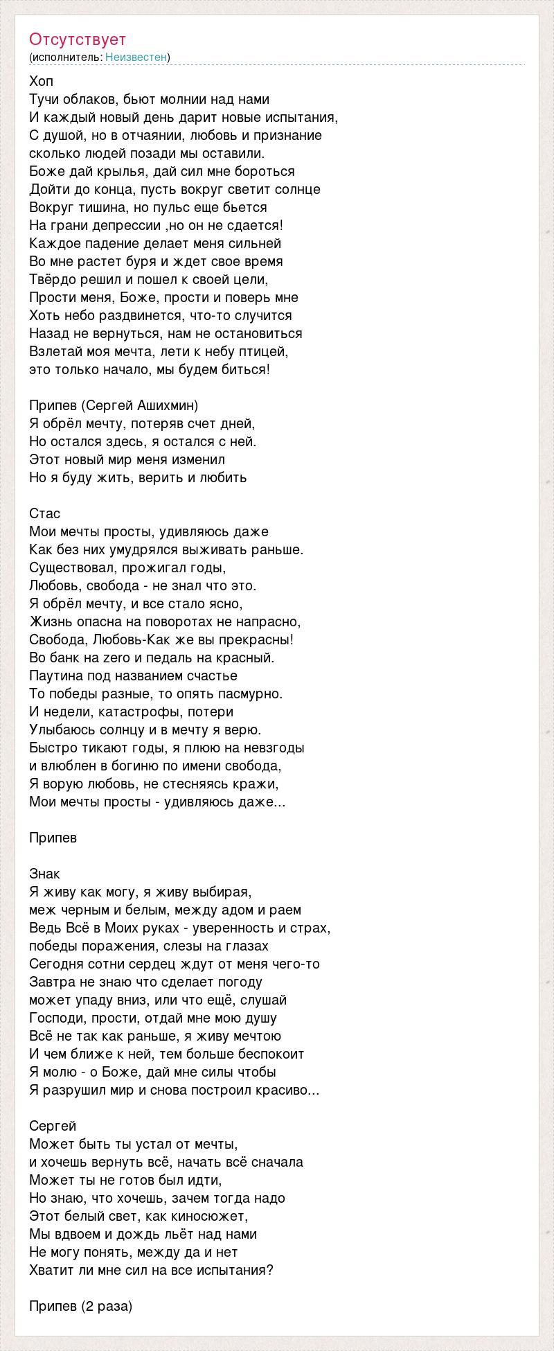 Хоп Тучи облаков, бьют молнии над нами И каждый новый день дарит новые испытания, С душой, но в отчаянии, любовь и признание сколько людей позади мы оставили. Боже дай крылья, дай сил мне бороться Дойти до конца, пусть вокруг светит солнце Вокруг тишина, но пульс еще бьется На грани депрессии ,но он не сдается! Каждое падение делает меня сильней Во мне растет буря и ждет свое время Твёрдо решил и пошел к своей цели, Прости меня, Боже, прости и поверь мне Хоть небо раздвинется, что-то случится Назад не вернуться, нам не остановиться Взлетай моя мечта, лети к небу птицей, это только начало, мы будем биться! Припев (Сергей Ашихмин) Я обрёл мечту, потеряв счет дней, Но остался здесь, я остался с ней. Этот новый мир меня изменил Но я буду жить, верить и любить Стас Мои мечты просты, удивляюсь даже Как без них умудрялся выживать раньше. Существовал, прожигал годы, Любовь, свобода - не знал что это. Я обрёл мечту, и все стало ясно, Жизнь опасна на поворотах не напрасно, Свобода, Любовь-Как же вы прекрасны! Во банк на zero и педаль на красный. Паутина под названием счастье То победы разные, то опять пасмурно. И недели, катастрофы, потери Улыбаюсь солнцу и в мечту я верю. Быстро тикают годы, я плюю на невзгоды и влюблен в богиню по имени свобода, Я ворую любовь, не стесняясь кражи, Мои мечты просты - удивляюсь даже... Припев Знак Я живу как могу, я живу выбирая, меж черным и белым, между адом и раем Ведь Всё в Моих руках - уверенность и страх, победы поражения, слезы на глазах Сегодня сотни сердец ждут от меня чего-то Завтра не знаю что сделает погоду может упаду вниз, или что ещё, слушай Господи, прости, отдай мне мою душу Всё не так как раньше, я живу мечтою И чем ближе к ней, тем больше беспокоит Я молю - о Боже, дай мне силы чтобы Я разрушил мир и снова построил красиво... Сергей Может быть ты устал от мечты, и хочешь вернуть всё, начать всё сначала Может ты не готов был идти, Но знаю, что хочешь, зачем тогда надо Этот белый свет, как киносюжет, Мы вдвоем и дождь льёт над нами Не могу понять, между да и нет Хватит ли мне сил на все испытания? Припев (2 раза)