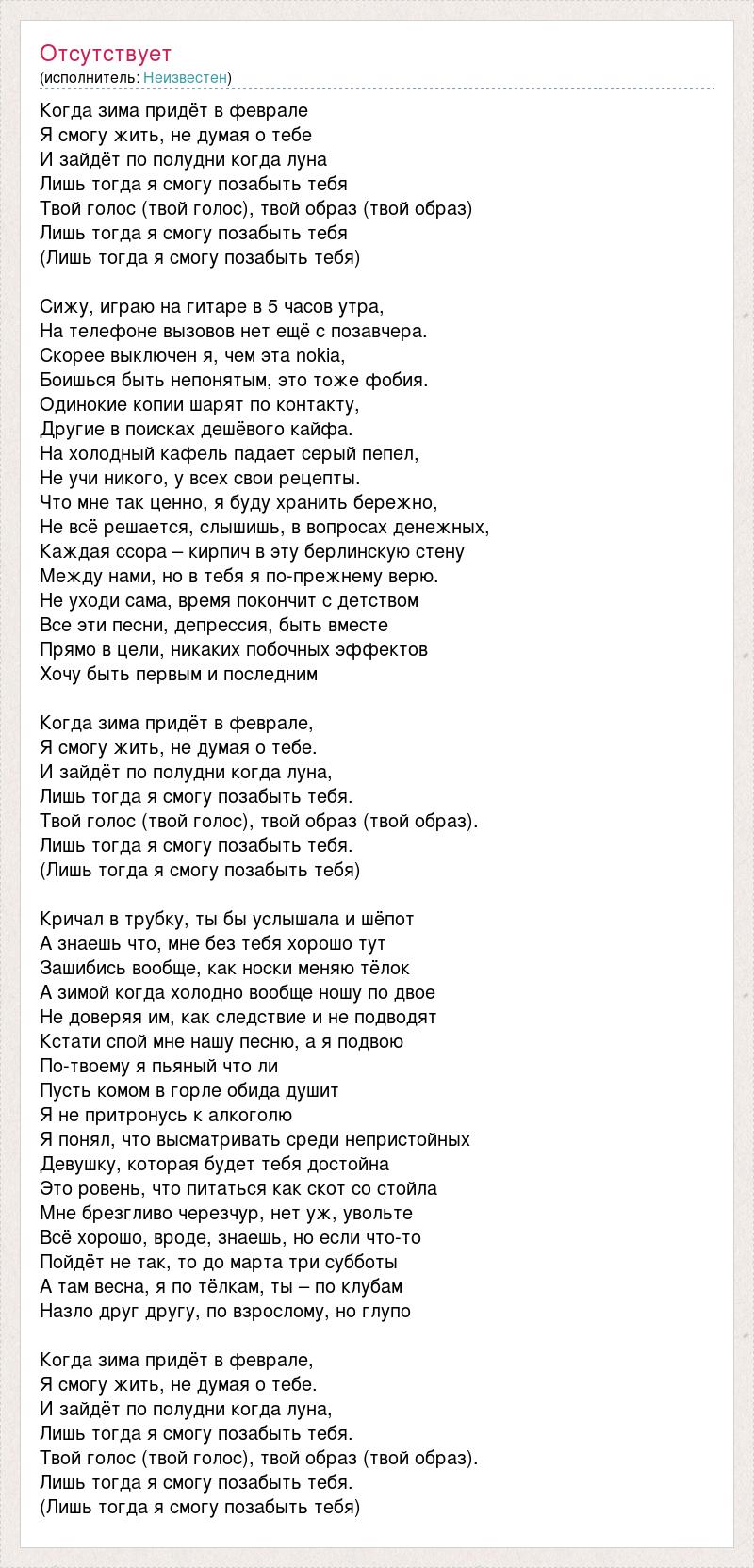 Когда зима придёт в феврале Я смогу жить, не думая о тебе И зайдёт по полудни когда луна Лишь тогда я смогу позабыть тебя Твой голос (твой голос), твой образ (твой образ) Лишь тогда я смогу позабыть тебя (Лишь тогда я смогу позабыть тебя) Сижу, играю на гитаре в 5 часов утра, На телефоне вызовов нет ещё с позавчера. Скорее выключен я, чем эта nokia, Боишься быть непонятым, это тоже фобия. Одинокие копии шарят по контакту, Другие в поисках дешёвого кайфа. На холодный кафель падает серый пепел, Не учи никого, у всех свои рецепты. Что мне так ценно, я буду хранить бережно, Не всё решается, слышишь, в вопросах денежных, Каждая ссора – кирпич в эту берлинскую стену Между нами, но в тебя я по-прежнему верю. Не уходи сама, время покончит с детством Все эти песни, депрессия, быть вместе Прямо в цели, никаких побочных эффектов Хочу быть первым и последним Когда зима придёт в феврале, Я смогу жить, не думая о тебе. И зайдёт по полудни когда луна, Лишь тогда я смогу позабыть тебя. Твой голос (твой голос), твой образ (твой образ). Лишь тогда я смогу позабыть тебя. (Лишь тогда я смогу позабыть тебя) Кричал в трубку, ты бы услышала и шёпот А знаешь что, мне без тебя хорошо тут Зашибись вообще, как носки меняю тёлок А зимой когда холодно вообще ношу по двое Не доверяя им, как следствие и не подводят Кстати спой мне нашу песню, а я подвою По-твоему я пьяный что ли Пусть комом в горле обида душит Я не притронусь к алкоголю Я понял, что высматривать среди непристойных Девушку, которая будет тебя достойна Это ровень, что питаться как скот со стойла Мне брезгливо черезчур, нет уж, увольте Всё хорошо, вроде, знаешь, но если что-то Пойдёт не так, то до марта три субботы А там весна, я по тёлкам, ты – по клубам Назло друг другу, по взрослому, но глупо Когда зима придёт в феврале, Я смогу жить, не думая о тебе. И зайдёт по полудни когда луна, Лишь тогда я смогу позабыть тебя. Твой голос (твой голос), твой образ (твой образ). Лишь тогда я смогу позабыть тебя. (Лишь тогда я смогу позабыть тебя)