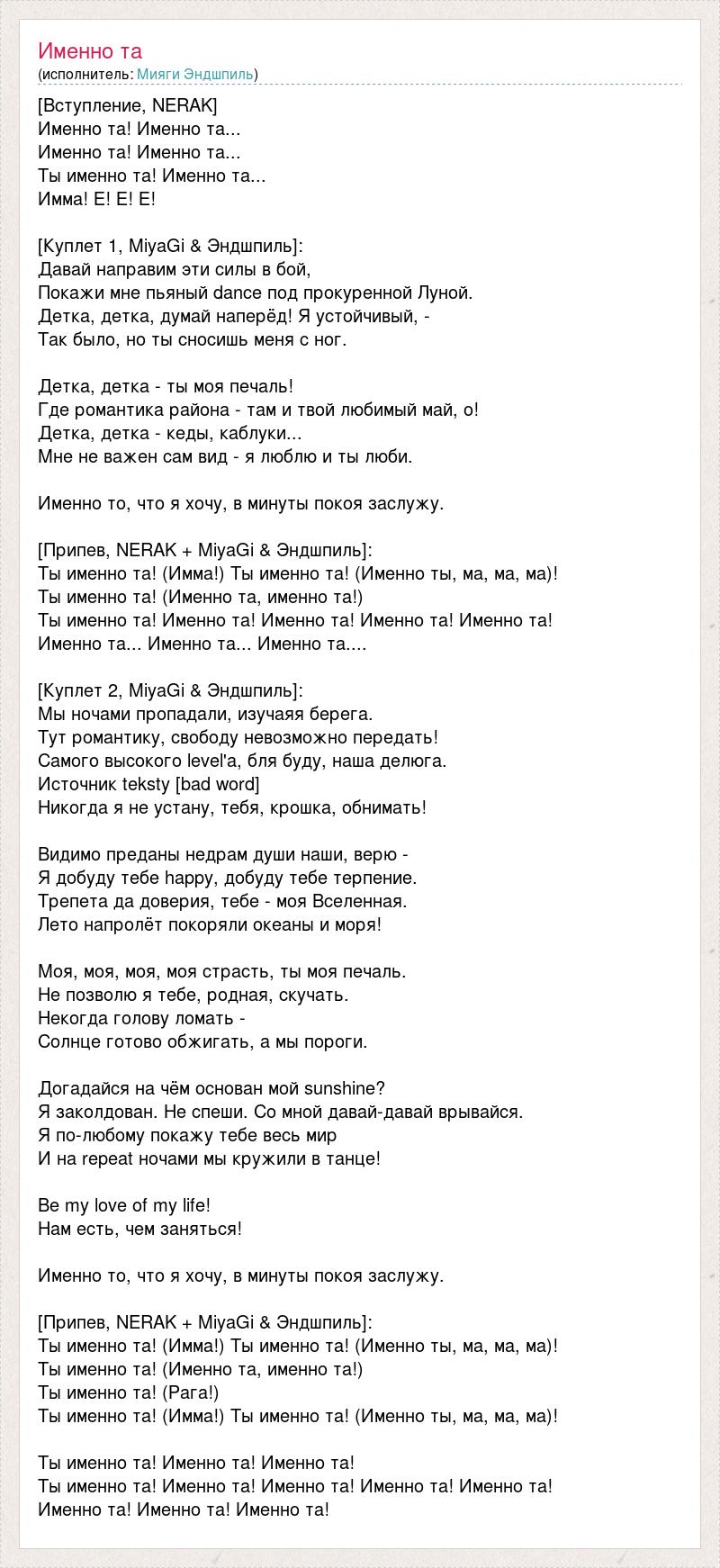 [Вступление, NERAK] Именно та! Именно та... Именно та! Именно та... Ты именно та! Именно та... Имма! Е! Е! Е! [Куплет 1, MiyaGi & Эндшпиль]: Давай направим эти силы в бой, Покажи мне пьяный dаnce под прокуренной Луной. Детка, детка, думай наперёд! Я устойчивый, - Так было, но ты сносишь меня с ног. Детка, детка - ты моя печаль! Где романтика района - там и твой любимый май, о! Детка, детка - кеды, каблуки... Мне не важен сам вид - я люблю и ты люби. Именно то, что я хочу, в минуты покоя заслужу. [Припев, NERAK + MiyaGi & Эндшпиль]: Ты именно та! (Имма!) Ты именно та! (Именно ты, ма, ма, ма)! Ты именно та! (Именно та, именно та!) Ты именно та! Именно та! Именно та! Именно та! Именно та! Именно та... Именно та... Именно та.... [Куплет 2, MiyaGi & Эндшпиль]: Мы ночами пропадали, изучаяя берега. Тут романтику, свободу невозможно передать! Самого высокого level'а, бля буду, наша делюга. Источник teksty [bad word] Никогда я не устану, тебя, крошка, обнимать! Видимо преданы недрам души наши, верю - Я добуду тебе happy, добуду тебе терпение. Трепета да доверия, тебе - моя Вселенная. Лето напролёт покоряли океаны и моря! Моя, моя, моя, моя страсть, ты моя печаль. Не позволю я тебе, родная, скучать. Некогда голову ломать - Солнце готово обжигать, а мы пороги. Догадайся на чём основан мой sunshine? Я заколдован. Не спеши. Со мной давай-давай врывайся. Я по-любому покажу тебе весь мир И на repeat ночами мы кружили в танце! Be my love of my life! Нам есть, чем заняться! Именно то, что я хочу, в минуты покоя заслужу. [Припев, NERAK + MiyaGi & Эндшпиль]: Ты именно та! (Имма!) Ты именно та! (Именно ты, ма, ма, ма)! Ты именно та! (Именно та, именно та!) Ты именно та! (Рага!) Ты именно та! (Имма!) Ты именно та! (Именно ты, ма, ма, ма)! Ты именно та! Именно та! Именно та! Ты именно та! Именно та! Именно та! Именно та! Именно та! Именно та! Именно та! Именно та!