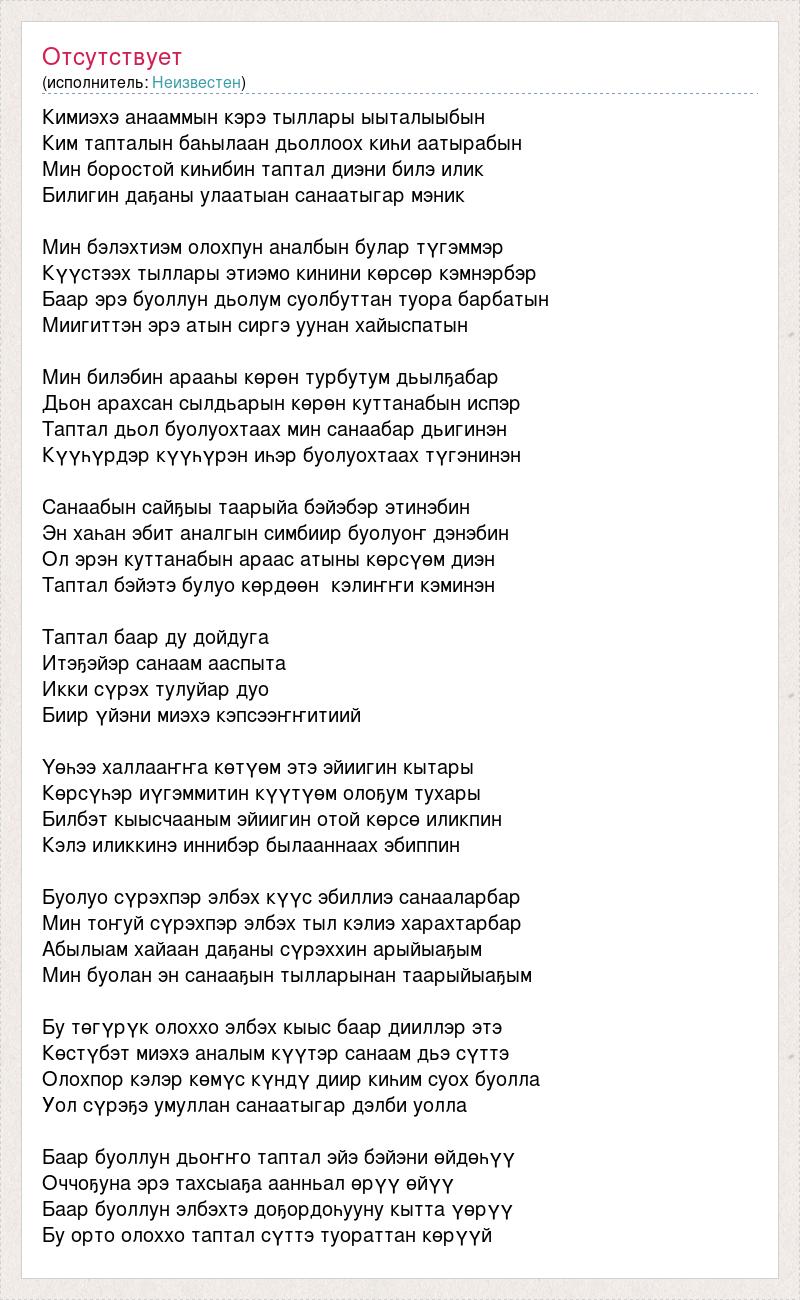 Кимиэхэ анааммын кэрэ тыллары ыыталыыбын Ким тапталын баһылаан дьоллоох киһи аатырабын Мин боростой киһибин таптал диэни билэ илик Билигин даҕаны улаатыан санаатыгар мэник Мин бэлэхтиэм олохпун аналбын булар түгэммэр Күүстээх тыллары этиэмо кинини көрсөр кэмнэрбэр Баар эрэ буоллун дьолум суолбуттан туора барбатын Миигиттэн эрэ атын сиргэ уунан хайыспатын Мин билэбин арааһы көрөн турбутум дьылҕабар Дьон арахсан сылдьарын көрөн куттанабын испэр Таптал дьол буолуохтаах мин санаабар дьигинэн Күүһүрдэр күүһүрэн иһэр буолуохтаах түгэнинэн Санаабын сайҕыы таарыйа бэйэбэр этинэбин Эн хаһан эбит аналгын симбиир буолуоҥ дэнэбин Ол эрэн куттанабын араас атыны көрсүөм диэн Таптал бэйэтэ булуо көрдөөн кэлиҥҥи кэминэн Таптал баар ду дойдуга Итэҕэйэр санаам ааспыта Икки сүрэх тулуйар дуо Биир үйэни миэхэ кэпсээҥҥитиий Үөһээ халлааҥҥа көтүөм этэ эйиигин кытары Көрсүһэр иүгэммитин күүтүөм олоҕум тухары Билбэт кыысчааным эйиигин отой көрсө иликпин Кэлэ иликкинэ иннибэр былааннаах эбиппин Буолуо сүрэхпэр элбэх күүс эбиллиэ санааларбар Мин тоҥуй сүрэхпэр элбэх тыл кэлиэ харахтарбар Абылыам хайаан даҕаны сүрэххин арыйыаҕым Мин буолан эн санааҕын тылларынан таарыйыаҕым Бу төгүрүк олоххо элбэх кыыс баар дииллэр этэ Көстүбэт миэхэ аналым күүтэр санаам дьэ сүттэ Олохпор кэлэр көмүс күндү диир киһим суох буолла Уол сүрэҕэ умуллан санаатыгар дэлби уолла Баар буоллун дьоҥҥо таптал эйэ бэйэни өйдөһүү Оччоҕуна эрэ тахсыаҕа аанньал өрүү өйүү Баар буоллун элбэхтэ доҕордоһууну кытта үөрүү Бу орто олоххо таптал сүттэ туораттан көрүүй