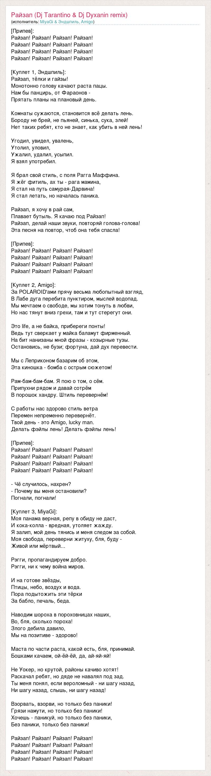 [Припев]: Райзап! Райзап! Райзап! Райзап! Райзап! Райзап! Райзап! Райзап! Райзап! Райзап! Райзап! Райзап! Райзап! Райзап! Райзап! Райзап! [Куплет 1, Эндшпиль]: Райзап, тёлки и гайзы! Монотонно голову качают раста пацы. Нам бы панцирь, от Фараонов - Прятать планы на плановый день. Комнаты сужаются, становится всё делать лень. Бороду не брей, не пьяней, синька, сука, злей! Нет таких ребят, кто не знает, как убить в ней лень! Угодил, увидел, увалень, Утолил, уловил, Ужалил, удалил, усыпил. Я взял употребил. Я брал свой стиль, с поля Рагга Маффина. Я жёг фитиль, ах ты - рага мамина, Я стал на путь самурая-Дарвина! Я стал летать, но началась паника. Райзап, я хочу в рай сам, Плавает бутыль. Я качаю под Райзап! Райзап, делай наши звуки, повторяй голова-голова! Эта песня на повтор, чтоб она тебя спасла! [Припев]: Райзап! Райзап! Райзап! Райзап! Райзап! Райзап! Райзап! Райзап! Райзап! Райзап! Райзап! Райзап! Райзап! Райзап! Райзап! Райзап! [Куплет 2, Amigo]: За POLAROID'ами прячу весьма любопытный взгляд, В Лабе дуга перебита пунктиром, мыслей водопад. Мы мечтаем о свободе, мы хотим тонуть в любви, Но нас тянут вниз грехи, там и тут стерегут они. Это life, а не байка, прибереги понты! Ведь тут сверкает у майка баламут фирменный. На бит нанизаны мной фразы - козырные тузы. Остановись, не бузи; фортуна, дай дух перевести. Мы с Леприконом базарим об этом, Эта киношка - бомба с острым сюжетом! Рам-бам-бам-бам. Я пою о том, о сём. Припухни рядом и давай сотрём В порошок хандру. Штиль перевернём! С работы нас здорово стиль ветра Перемен непременно перевернёт. Твой день - это Amigo, lucky man. Делать фэйлы лень! Делать фэйлы лень! [Припев]: Райзап! Райзап! Райзап! Райзап! Райзап! Райзап! Райзап! Райзап! Райзап! Райзап! Райзап! Райзап! Райзап! Райзап! Райзап! Райзап! - Чё случилось, нахрен? - Почему вы меня остановили? Погнали, погнали! [Куплет 3, MiyaGi]: Моя панама верная, репу в обиду не даст, И кока-колла - вредная, утоляет жажду. Я залип, мой день тянись и меня следом за собой. Моя свобода, переверни житуху, бля, буду - Живой или мёртвый... Рэгги, пропагандируем добро. Рэгги, ни к чему война миров. И на готове звёзды, Птицы, небо, воздух и вода. Пора подытожить эти тёрки За бабло, печаль, беда. Наводим шороха в пороховницах наших, Во, бля, сколько пороха! Злого дебила давило, Мы на позитиве - здорово! Маста по части раста, какой есть, бля, принимай. Бошками качаем, ой-ёй-ёй, да, ай-яй-яй! Не Уокер, но крутой, районы качиво хотят! Раскачал ребят, но дяде не навалял под зад. Ты меня понял, если вероломный - ни шагу назад, Ни шагу назад, слышь, ни шагу назад! Взорвать, взорви, но только без паники! Грязи намути, но только без паники! Хочешь - паникуй, но только без паники, Без паники, только без паники! Райзап! Райзап! Райзап! Райзап! Райзап! Райзап! Райзап! Райзап! Райзап! Райзап! Райзап! Райзап! Райзап! Райзап! Райзап! Райзап!