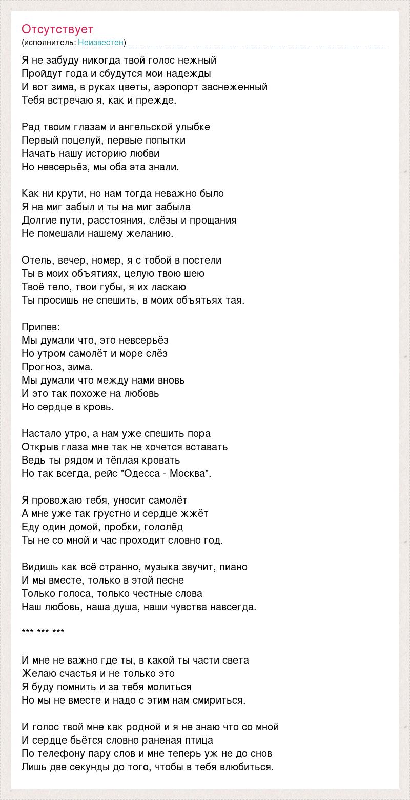 Я не забуду никогда твой голос нежный Пройдут года и сбудутся мои надежды И вот зима, в руках цветы, аэропорт заснеженный Тебя встречаю я, как и прежде. Рад твоим глазам и ангельской улыбке Первый поцелуй, первые попытки Начать нашу историю любви Но невсерьёз, мы оба эта знали. Как ни крути, но нам тогда неважно было Я на миг забыл и ты на миг забыла Долгие пути, расстояния, слёзы и прощания Не помешали нашему желанию. Отель, вечер, номер, я с тобой в постели Ты в моих объятиях, целую твою шею Твоё тело, твои губы, я их ласкаю Ты просишь не спешить, в моих объятьях тая. Припев: Мы думали что, это невсерьёз Но утром самолёт и море слёз Прогноз, зима. Мы думали что между нами вновь И это так похоже на любовь Но сердце в кровь. Настало утро, а нам уже спешить пора Открыв глаза мне так не хочется вставать Ведь ты рядом и тёплая кровать Но так всегда, рейс "Одесса - Москва". Я провожаю тебя, уносит самолёт А мне уже так грустно и сердце жжёт Еду один домой, пробки, гололёд Ты не со мной и час проходит словно год. Видишь как всё странно, музыка звучит, пиано И мы вместе, только в этой песне Только голоса, только честные слова Наш любовь, наша душа, наши чувства навсегда. *** *** *** И мне не важно где ты, в какой ты части света Желаю счастья и не только это Я буду помнить и за тебя молиться Но мы не вместе и надо с этим нам смириться. И голос твой мне как родной и я не знаю что со мной И сердце бьётся словно раненая птица По телефону пару слов и мне теперь уж не до снов Лишь две секунды до того, чтобы в тебя влюбиться.