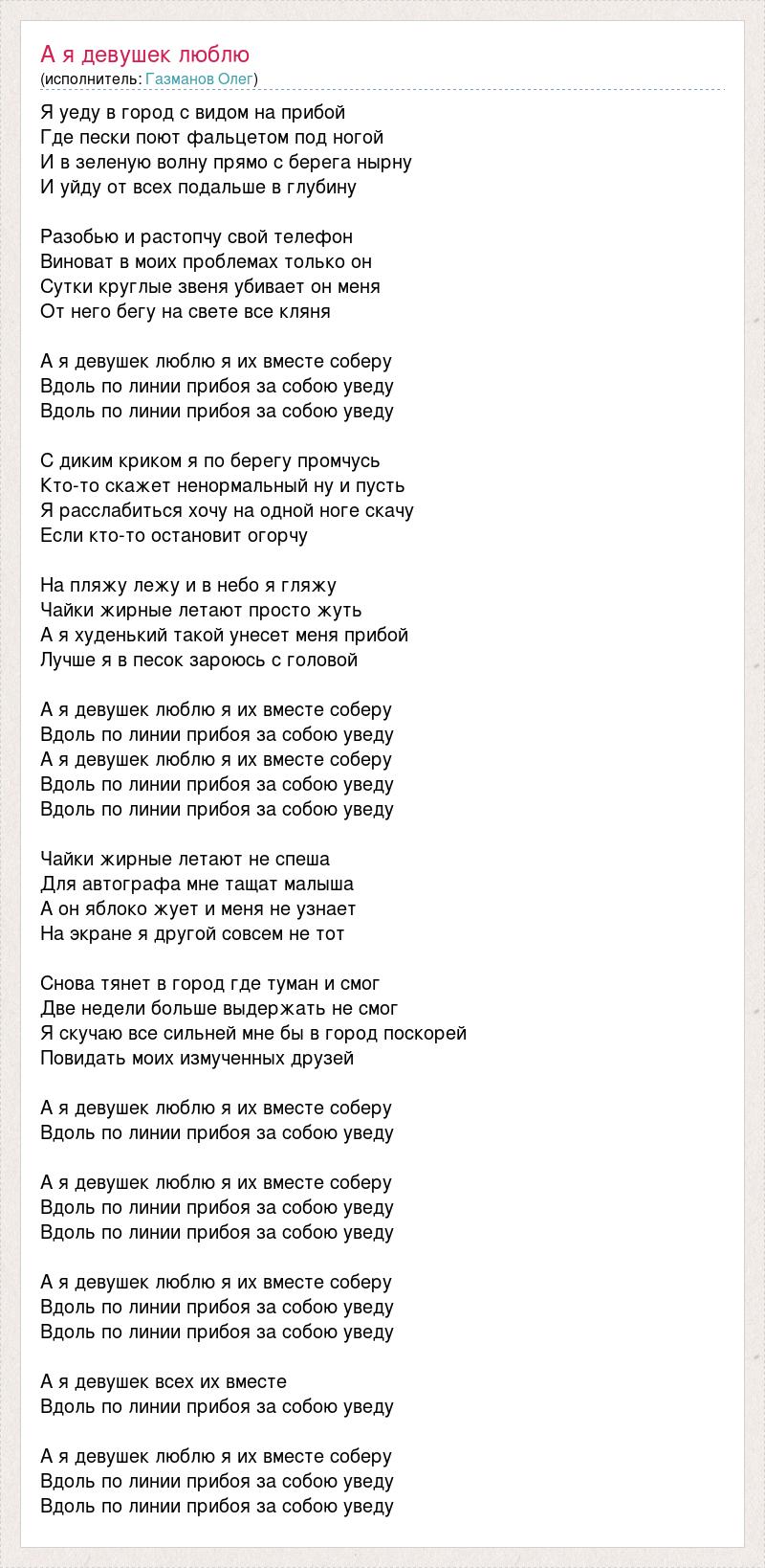 Я уеду в город с видом на прибой Где пески поют фальцетом под ногой И в зеленую волну прямо с берега нырну И уйду от всех подальше в глубину Разобью и растопчу свой телефон Виноват в моих проблемах только он Сутки круглые звеня убивает он меня От него бегу на свете все кляня А я девушек люблю я их вместе соберу Вдоль по линии прибоя за собою уведу Вдоль по линии прибоя за собою уведу С диким криком я по берегу промчусь Кто-то скажет ненормальный ну и пусть Я расслабиться хочу на одной ноге скачу Если кто-то остановит огорчу На пляжу лежу и в небо я гляжу Чайки жирные летают просто жуть А я худенький такой унесет меня прибой Лучше я в песок зароюсь с головой А я девушек люблю я их вместе соберу Вдоль по линии прибоя за собою уведу А я девушек люблю я их вместе соберу Вдоль по линии прибоя за собою уведу Вдоль по линии прибоя за собою уведу Чайки жирные летают не спеша Для автографа мне тащат малыша А он яблоко жует и меня не узнает На экране я другой совсем не тот Снова тянет в город где туман и смог Две недели больше выдержать не смог Я скучаю все сильней мне бы в город поскорей Повидать моих измученных друзей А я девушек люблю я их вместе соберу Вдоль по линии прибоя за собою уведу А я девушек люблю я их вместе соберу Вдоль по линии прибоя за собою уведу Вдоль по линии прибоя за собою уведу А я девушек люблю я их вместе соберу Вдоль по линии прибоя за собою уведу Вдоль по линии прибоя за собою уведу А я девушек всех их вместе Вдоль по линии прибоя за собою уведу А я девушек люблю я их вместе соберу Вдоль по линии прибоя за собою уведу Вдоль по линии прибоя за собою уведу