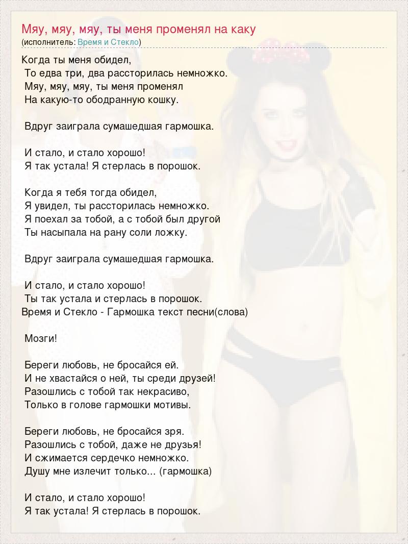 Когда ты меня обидел, То едва три, два рассторилась немножко. Мяу, мяу, мяу, ты меня променял На какую-то ободранную кошку. Вдруг заиграла сумашедшая гармошка. И стало, и стало хорошо! Я так устала! Я стерлась в порошок. Когда я тебя тогда обидел, Я увидел, ты рассторилась немножко. Я поехал за тобой, а с тобой был другой Ты насыпала на рану соли ложку. Вдруг заиграла сумашедшая гармошка. И стало, и стало хорошо! Ты так устала и стерлась в порошок. Время и Стекло - Гармошка текст песни(слова) Мозги! Береги любовь, не бросайся ей. И не хвастайся о ней, ты среди друзей! Разошлись с тобой так некрасиво, Только в голове гармошки мотивы. Береги любовь, не бросайся зря. Разошлись с тобой, даже не друзья! И сжимается сердечко немножко. Душу мне излечит только... (гармошка) И стало, и стало хорошо! Я так устала! Я стерлась в порошок.
