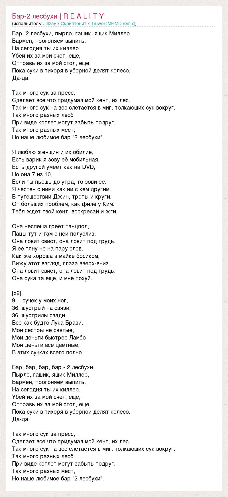 Бар, 2 лесбухи, пырло, гашик, ящик Миллер, Бармен, прогоняем выпить. На сегодня ты их киллер, Убей их за мой счет, еще, Отправь их за мой стол, еще, Пока суки в тихоря в уборной делят колесо. Да-да. Так много сук за пресс, Сделает все что придумал мой кент, их лес. Так много сук на вес слетается в миг, толкающих сук вокруг. Так много разных лесб При виде котлет могут забыть подруг. Так много разных мест, Но наше любимое бар "2 лесбухи”. Я люблю женщин и их обилие, Есть варик я зову её мобильная. Есть другой умеет как на DVD, Но она 7 из 10, Если ты пьешь до утра, то зови ее. Я честен с ними как ни с кем другим. В путешествии Джин, тропы и круги. От больших проблем, как филе у Ким. Тебя ждет твой кент, воскресай и жги. Она неспеша греет танцпол, Пацы тут и там с ней полуслиз, Она ловит свист, она ловит под грудь. Я ее тяну не на пару слов. Как же хороша в майке босиком, Вижу этот взгляд, глаза вверх-вниз. Она ловит свист, она ловит под грудь. Она сука та еще, и мне похуй. [х2] 9… сучек у моих ног, 36, шустрый на связи, 36, шустрилы сзади, Все как будто Лука Брази. Мои сестры не святые, Мои деньги быстрее Ламбо Мои деньги все цветные, В этих сучках всего полно. Бар, бар, бар, бар - 2 лесбухи, Пырло, гашик, ящик Миллер, Бармен, прогоняем выпить. На сегодня ты их киллер, Убей их за мой счет, еще, Отправь их за мой стол, еще, Пока суки в тихоря в уборной делят колесо. Да-да. Так много сук за пресс, Сделает все что придумал мой кент, их лес. Так много сук на вес слетается в миг, толкающих сук вокруг. Так много разных лесб При виде котлет могут забыть подруг. Так много разных мест, Но наше любимое бар "2 лесбухи”.