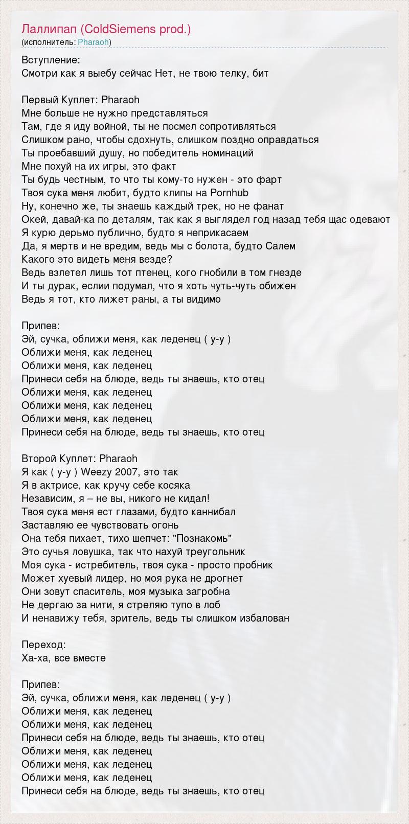 Вступление: Смотри как я выебу сейчас Нет, не твою телку, бит Первый Куплет: Pharaoh Мне больше не нужно представляться Там, где я иду войной, ты не посмел сопротивляться Слишком рано, чтобы сдохнуть, слишком поздно оправдаться Ты проебавший душу, но победитель номинаций Мне похуй на их игры, это факт Ты будь честным, то что ты кому-то нужен - это фарт Твоя сука меня любит, будто клипы на Pornhub Ну, конечно же, ты знаешь каждый трек, но не фанат Окей, давай-ка по деталям, так как я выглядел год назад тебя щас одевают Я курю дерьмо публично, будто я неприкасаем Да, я мертв и не вредим, ведь мы с болота, будто Салем Какого это видеть меня везде? Ведь взлетел лишь тот птенец, кого гнобили в том гнезде И ты дурак, еслии подумал, что я хоть чуть-чуть обижен Ведь я тот, кто лижет раны, а ты видимо Припев: Эй, сучка, оближи меня, как леденец ( у-у ) Оближи меня, как леденец Оближи меня, как леденец Принеси себя на блюде, ведь ты знаешь, кто отец Оближи меня, как леденец Оближи меня, как леденец Оближи меня, как леденец Принеси себя на блюде, ведь ты знаешь, кто отец Второй Куплет: Pharaoh Я как ( у-у ) Weezy 2007, это так Я в актрисе, как кручу себе косяка Независим, я – не вы, никого не кидал! Твоя сука меня ест глазами, будто каннибал Заставляю ее чувствовать огонь Она тебя пихает, тихо шепчет: "Познакомь" Это сучья ловушка, так что нахуй треугольник Моя сука - истребитель, твоя сука - просто пробник Может хуевый лидер, но моя рука не дрогнет Они зовут спаситель, моя музыка загробна Не дергаю за нити, я стреляю тупо в лоб И ненавижу тебя, зритель, ведь ты слишком избалован Переход: Ха-ха, все вместе Припев: Эй, сучка, оближи меня, как леденец ( у-у ) Оближи меня, как леденец Оближи меня, как леденец Принеси себя на блюде, ведь ты знаешь, кто отец Оближи меня, как леденец Оближи меня, как леденец Оближи меня, как леденец Принеси себя на блюде, ведь ты знаешь, кто отец