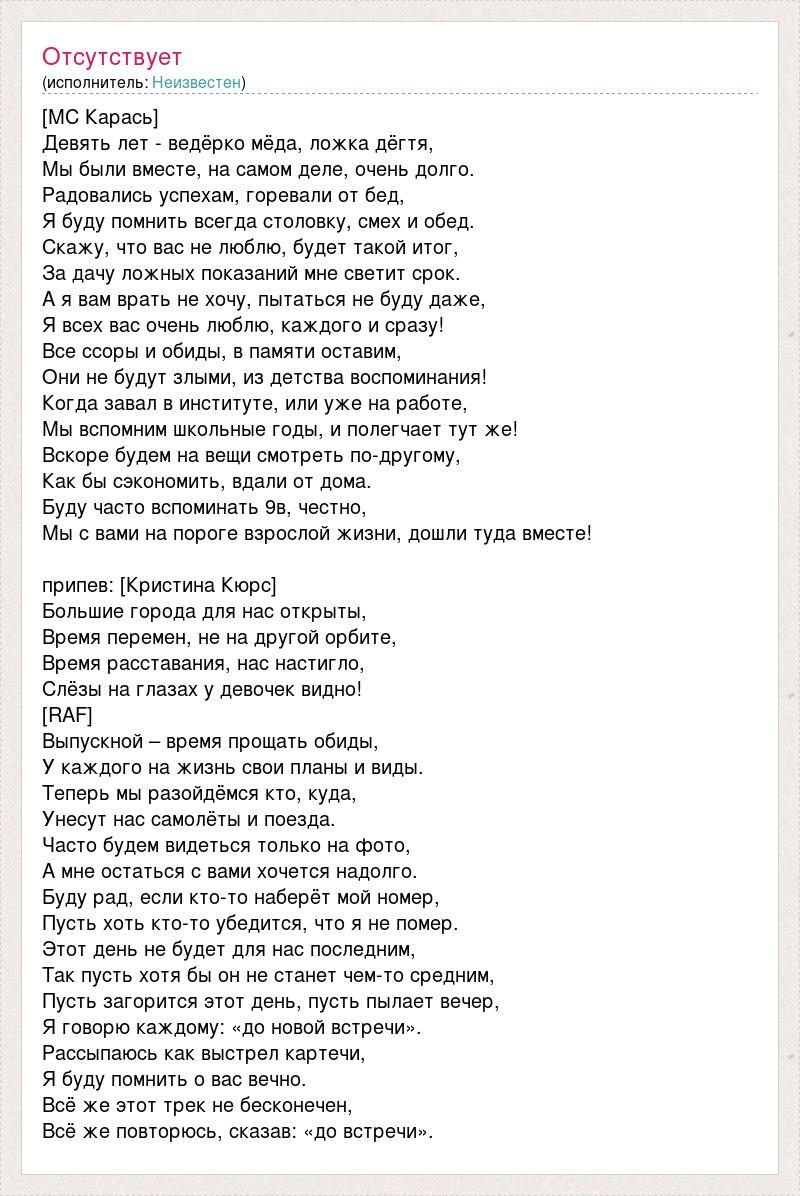 [МС Карась] Девять лет - ведёрко мёда, ложка дёгтя, Мы были вместе, на самом деле, очень долго. Радовались успехам, горевали от бед, Я буду помнить всегда столовку, смех и обед. Скажу, что вас не люблю, будет такой итог, За дачу ложных показаний мне светит срок. А я вам врать не хочу, пытаться не буду даже, Я всех вас очень люблю, каждого и сразу! Все ссоры и обиды, в памяти оставим, Они не будут злыми, из детства воспоминания! Когда завал в институте, или уже на работе, Мы вспомним школьные годы, и полегчает тут же! Вскоре будем на вещи смотреть по-другому, Как бы сэкономить, вдали от дома. Буду часто вспоминать 9в, честно, Мы с вами на пороге взрослой жизни, дошли туда вместе! припев: [Кристина Кюрс] Большие города для нас открыты, Время перемен, не на другой орбите, Время расставания, нас настигло, Слёзы на глазах у девочек видно! [RAF] Выпускной – время прощать обиды, У каждого на жизнь свои планы и виды. Теперь мы разойдёмся кто, куда, Унесут нас самолёты и поезда. Часто будем видеться только на фото, А мне остаться с вами хочется надолго. Буду рад, если кто-то наберёт мой номер, Пусть хоть кто-то убедится, что я не помер. Этот день не будет для нас последним, Так пусть хотя бы он не станет чем-то средним, Пусть загорится этот день, пусть пылает вечер, Я говорю каждому: «до новой встречи». Рассыпаюсь как выстрел картечи, Я буду помнить о вас вечно. Всё же этот трек не бесконечен, Всё же повторюсь, сказав: «до встречи».