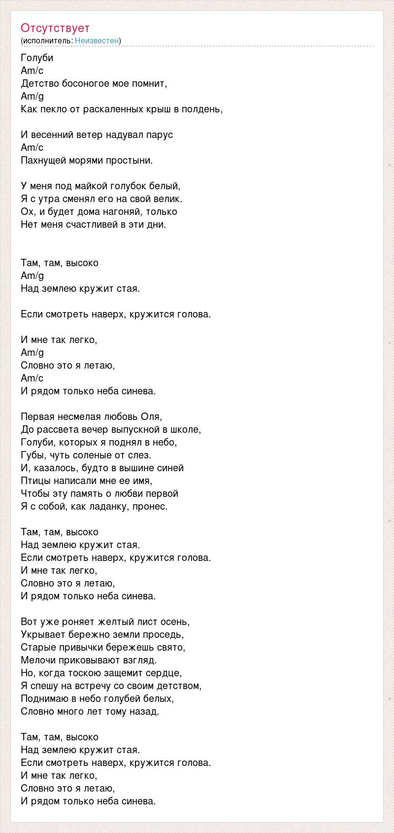 Голуби Am/c Детство босоногое мое помнит, Am/g Как пекло от раскаленных крыш в полдень, И весенний ветер надувал парус Am/c Пахнущей морями простыни. У меня под майкой голубок белый, Я с утра сменял его на свой велик. Ох, и будет дома нагоняй, только Нет меня счастливей в эти дни. Там, там, высоко Am/g Над землею кружит стая. Если смотреть наверх, кружится голова. И мне так легко, Am/g Словно это я летаю, Am/c И рядом только неба синева. Первая несмелая любовь Оля, До рассвета вечер выпускной в школе, Голуби, которых я поднял в небо, Губы, чуть соленые от слез. И, казалось, будто в вышине синей Птицы написали мне ее имя, Чтобы эту память о любви первой Я с собой, как ладанку, пронес. Там, там, высоко Над землею кружит стая. Если смотреть наверх, кружится голова. И мне так легко, Словно это я летаю, И рядом только неба синева. Вот уже роняет желтый лист осень, Укрывает бережно земли проседь, Старые привычки бережешь свято, Мелочи приковывают взгляд. Но, когда тоскою защемит сердце, Я спешу на встречу со своим детством, Поднимаю в небо голубей белых, Словно много лет тому назад. Там, там, высоко Над землею кружит стая. Если смотреть наверх, кружится голова. И мне так легко, Словно это я летаю, И рядом только неба синева.