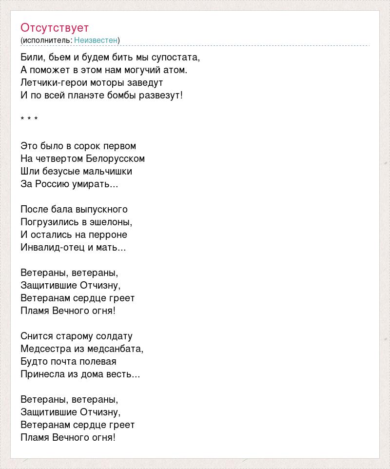 Били, бьем и будем бить мы супостата, А поможет в этом нам могучий атом. Летчики-герои моторы заведут И по всей планэте бомбы развезут! * * * Это было в сорок первом На четвертом Белорусском Шли безусые мальчишки За Россию умирать... После бала выпускного Погрузились в эшелоны, И остались на перроне Инвалид-отец и мать... Ветераны, ветераны, Защитившие Отчизну, Ветеранам сердце греет Пламя Вечного огня! Снится старому солдату Медсестра из медсанбата, Будто почта полевая Принесла из дома весть... Ветераны, ветераны, Защитившие Отчизну, Ветеранам сердце греет Пламя Вечного огня!