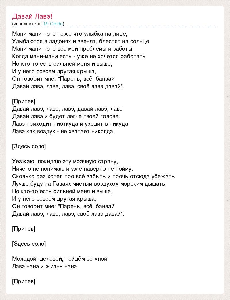 Мани-мани - это тоже что улыбка на лице, Улыбаются в ладонях и звенят, блестят на солнце. Мани-мани - это все мои проблемы и заботы, Когда мани-мани есть - уже не хочется работать. Но кто-то есть сильней меня и выше, И у него совсем другая крыша, Он говорит мне: "Парень, всё, банзай Давай лавэ, лавэ, лавэ, своё лавэ давай". [Припев] Давай лавэ, лавэ, лавэ, давай лавэ, лавэ Давай лавэ и будет легче твоей голове. Лавэ приходит ниоткуда и уходит в никуда Лавэ как воздух - не хватает никогда. [Здесь соло] Уезжаю, покидаю эту мрачную страну, Ничего не понимаю и уже наверно не пойму. Сколько раз хотел про всё забыть и прочь отсюда убежать Лучше буду на Гаваях чистым воздухом морским дышать Но кто-то есть сильней меня и выше, И у него совсем другая крыша, Он говорит мне: "Парень, всё, банзай Давай лавэ, лавэ, лавэ, своё лавэ давай". [Припев] [Здесь соло] Молодой, деловой, пойдём со мной Лавэ нанэ и жизнь нанэ [Припев]