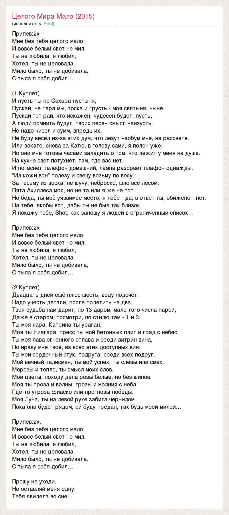 Припев:2х Мне без тебя целого мало И вовсе белый свет не мил. Ты не любила, я любил, Хотел, ты не целовала. Мило было, ты не добивала, С тыла я себя добил… (1 Куплет) И пусть ты не Сахара пустыня, Пускай, не пара мы, тоска и грусть - моя святыня, ныне. Пускай тот рай, что искажен, чудесен будет, пусть, А люди помнить будут, твоих песен смысл наизусть. Не надо чисел и сумм, впредь их. Не буду весел из-за этих дум, что лезут наобум мне, на рассвете. Или закате, снова за Катю, в голову сами, я полон уже. Но они мне готовы часами заладить о том, что лежит у меня на душе. На кухне свет потухнет, там, где вас нет. И погаснет телефон домашний, лампа разорвёт плафон однажды. “Из кожи вон” полезу и свечу возьму по весу. За тесьму из воска, не шучу, неброско, шло всё лесом. Пята Ахиллеса моя, но не та или я же не тот. Но беда, ты моё уязвимое место, я тебе - да, в ответ ты, обижено - нет. На тебе, якобы вот, дабы ты не был так близок. Я покажу тебе, Shot, как заношу я людей в ограниченный список… Припев:2х Мне без тебя целого мало И вовсе белый свет не мил. Ты не любила, я любил, Хотел, ты не целовала. Мило было, ты не добивала, С тыла я себя добил… (2 Куплет) Двадцать дней ещё плюс шесть, веду подсчёт. Надо учесть детали, после поделить на два. Твоя судьба нам дарит, по 13 даром, мало того числа парой, Даже в старом, посмотри, по стилю там - 1 и 3. Ты моя кара, Катрина ты ураган. Моя ты Ниагара, пресс ты мой бетонных плит и град с небес. Ты моя лава огненного сплава и среди витрин вина, По нраву мне твоё, из всех этих доступных вин. Ты мой сердечный стук, подруга, среди всех подруг. Мой вечный талисман, ты мой успех, ты слёзы или смех. Морозы и тепло, ты смысл моих слов. Мои цветы, походу дела розы белые, но без шипов. Моя ты проза и волны, грозы и молния с неба. Где-то угроза фиаско или прогнозы победы. Моя Луна, ты на левой руке забита чернилом. Пока она будет рядом, ей буду предан, так будь моей милой… Припев:2х. Мне без тебя целого мало И вовсе белый свет не мил. Ты не любила, я любил, Хотел, ты не целовала. Мило было, ты не добивала, С тыла я себя добил… Прошу не уходи. Не оставляй меня одну. Тебя явидела во сне...