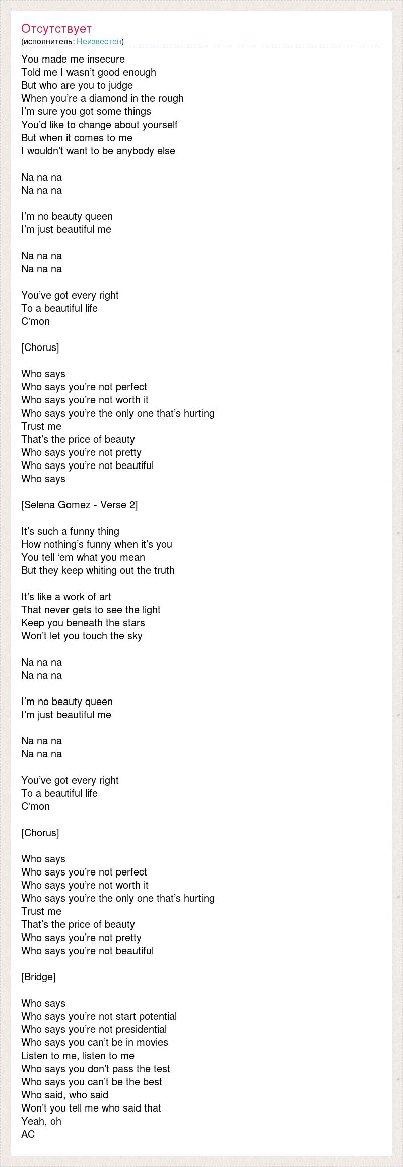 You made me insecure Told me I wasn’t good enough But who are you to judge When you’re a diamond in the rough I’m sure you got some things You’d like to change about yourself But when it comes to me I wouldn’t want to be anybody else Na na na Na na na I’m no beauty queen I’m just beautiful me Na na na Na na na You’ve got every right To a beautiful life C'mon [Chorus] Who says Who says you’re not perfect Who says you’re not worth it Who says you’re the only one that’s hurting Trust me That’s the price of beauty Who says you’re not pretty Who says you’re not beautiful Who says [Selena Gomez - Verse 2] It’s such a funny thing How nothing’s funny when it’s you You tell ‘em what you mean But they keep whiting out the truth It’s like a work of art That never gets to see the light Keep you beneath the stars Won’t let you touch the sky Na na na Na na na I’m no beauty queen I’m just beautiful me Na na na Na na na You’ve got every right To a beautiful life C'mon [Chorus] Who says Who says you’re not perfect Who says you’re not worth it Who says you’re the only one that’s hurting Trust me That’s the price of beauty Who says you’re not pretty Who says you’re not beautiful [Bridge] Who says Who says you’re not start potential Who says you’re not presidential Who says you can’t be in movies Listen to me, listen to me Who says you don’t pass the test Who says you can’t be the best Who said, who said Won’t you tell me who said that Yeah, oh AC