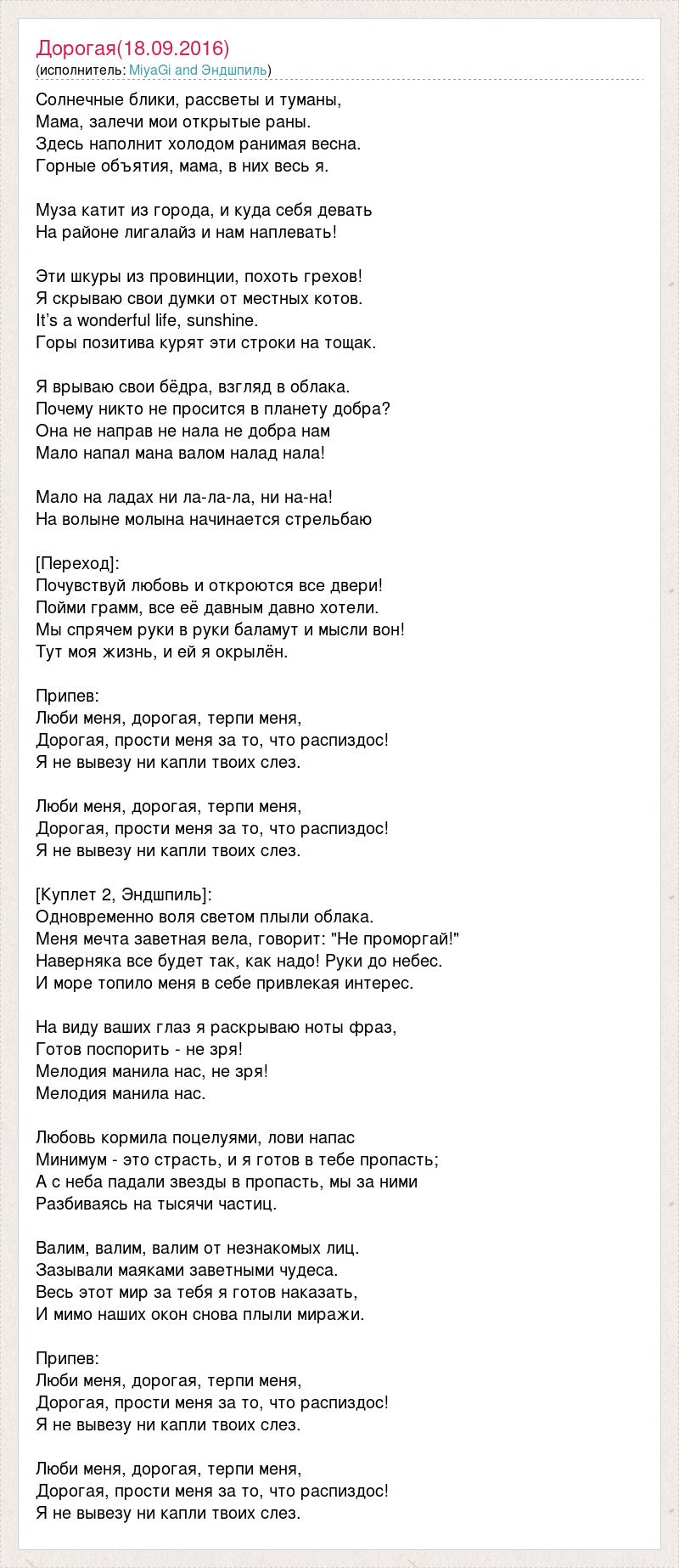 Солнечные блики, рассветы и туманы, Мама, залечи мои открытые раны. Здесь наполнит холодом ранимая весна. Горные объятия, мама, в них весь я. Муза катит из города, и куда себя девать На районе лигалайз и нам наплевать! Эти шкуры из провинции, похоть грехов! Я скрываю свои думки от местных котов. It’s a wonderful life, sunshine. Горы позитива курят эти строки на тощак. Я врываю свои бёдра, взгляд в облака. Почему никто не просится в планету добра? Она не направ не нала не добра нам Мало напал мана валом налад нала! Мало на ладах ни ла-ла-ла, ни на-на! На волыне молына начинается стрельбаю [Переход]: Почувствуй любовь и откроются все двери! Пойми грамм, все её давным давно хотели. Мы спрячем руки в руки баламут и мысли вон! Тут моя жизнь, и ей я окрылён. Припев: Люби меня, дорогая, терпи меня, Дорогая, прости меня за то, что распиздос! Я не вывезу ни капли твоих слез. Люби меня, дорогая, терпи меня, Дорогая, прости меня за то, что распиздос! Я не вывезу ни капли твоих слез. [Куплет 2, Эндшпиль]: Одновременно воля светом плыли облака. Меня мечта заветная вела, говорит: "Не проморгай!" Наверняка все будет так, как надо! Руки до небес. И море топило меня в себе привлекая интерес. На виду ваших глаз я раскрываю ноты фраз, Готов поспорить - не зря! Мелодия манила нас, не зря! Мелодия манила нас. Любовь кормила поцелуями, лови напас Минимум - это страсть, и я готов в тебе пропасть; А с неба падали звезды в пропасть, мы за ними Разбиваясь на тысячи частиц. Валим, валим, валим от незнакомых лиц. Зазывали маяками заветными чудеса. Весь этот мир за тебя я готов наказать, И мимо наших окон снова плыли миражи. Припев: Люби меня, дорогая, терпи меня, Дорогая, прости меня за то, что распиздос! Я не вывезу ни капли твоих слез. Люби меня, дорогая, терпи меня, Дорогая, прости меня за то, что распиздос! Я не вывезу ни капли твоих слез.