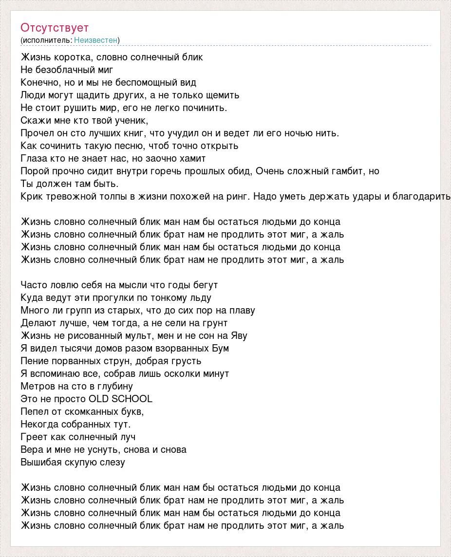 Жизнь коротка, словно солнечный блик Не безоблачный миг Конечно, но и мы не беспомощный вид Люди могут щадить других, а не только щемить Не стоит рушить мир, его не легко починить. Скажи мне кто твой ученик, Прочел он сто лучших книг, что учудил он и ведет ли его ночью нить. Как сочинить такую песню, чтоб точно открыть Глаза кто не знает нас, но заочно хамит Порой прочно сидит внутри горечь прошлых обид, Очень сложный гамбит, но Ты должен там быть. Крик тревожной толпы в жизни похожей на ринг. Надо уметь держать удары и благодарить Жизнь словно солнечный блик ман нам бы остаться людьми до конца Жизнь словно солнечный блик брат нам не продлить этот миг, а жаль Жизнь словно солнечный блик ман нам бы остаться людьми до конца Жизнь словно солнечный блик брат нам не продлить этот миг, а жаль Часто ловлю себя на мысли что годы бегут Куда ведут эти прогулки по тонкому льду Много ли групп из старых, что до сих пор на плаву Делают лучше, чем тогда, а не сели на грунт Жизнь не рисованный мульт, мен и не сон на Яву Я видел тысячи домов разом взорванных Бум Пение порванных струн, добрая грусть Я вспоминаю все, собрав лишь осколки минут Метров на сто в глубину Это не просто OLD SCHOOL Пепел от скомканных букв, Некогда собранных тут. Греет как солнечный луч Вера и мне не уснуть, снова и снова Вышибая скупую слезу Жизнь словно солнечный блик ман нам бы остаться людьми до конца Жизнь словно солнечный блик брат нам не продлить этот миг, а жаль Жизнь словно солнечный блик ман нам бы остаться людьми до конца Жизнь словно солнечный блик брат нам не продлить этот миг, а жаль