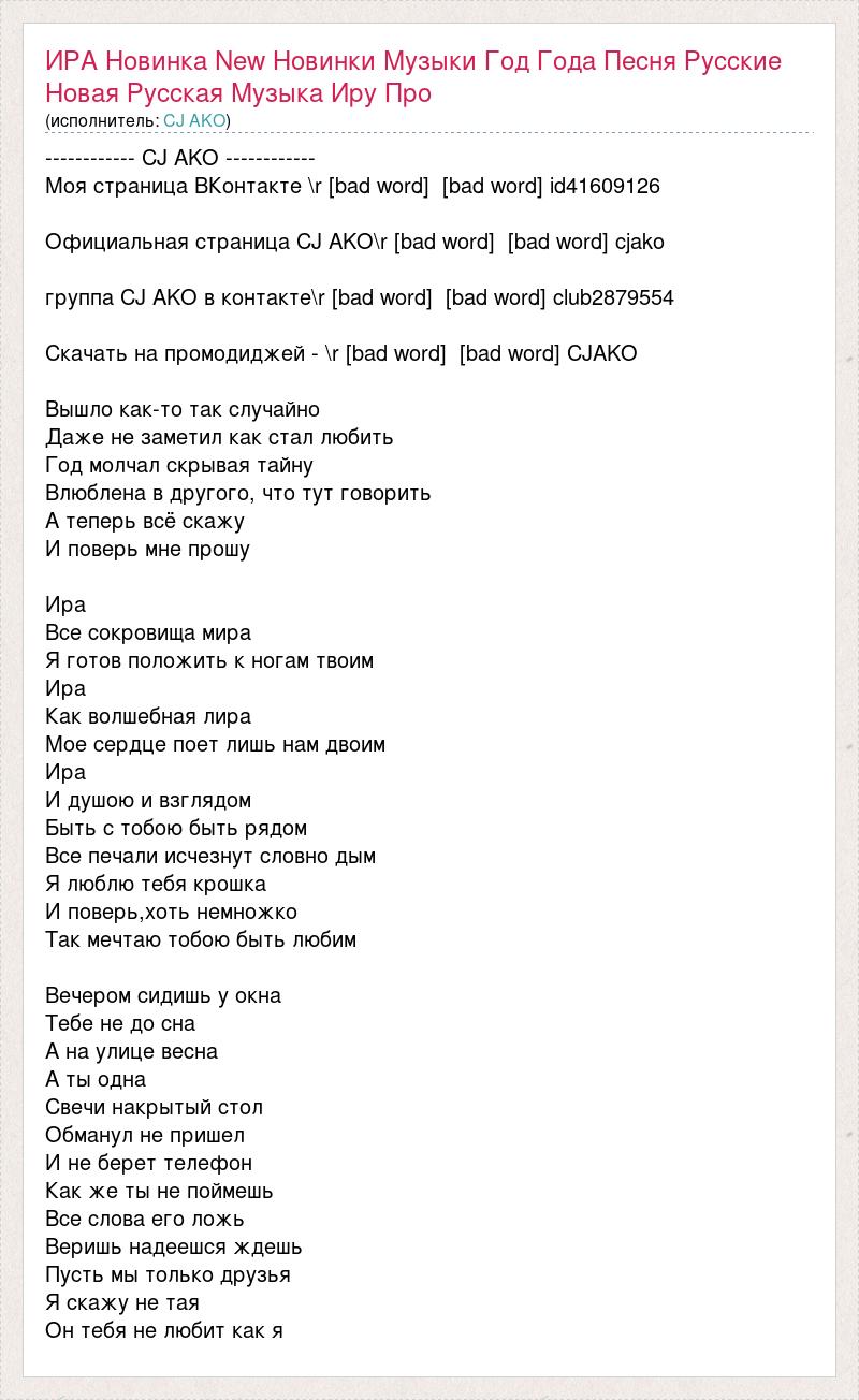 ------------ CJ AKO ------------ Моя страница ВКонтакте [bad word] [bad word] id41609126 Официальная страница CJ AKO [bad word] [bad word] cjako группа CJ AKO в контакте [bad word] [bad word] club2879554 Скачать на промодиджей - [bad word] [bad word] CJAKO Вышло как-то так случайно Даже не заметил как стал любить Год молчал скрывая тайну Влюблена в другого, что тут говорить А теперь всё скажу И поверь мне прошу Ира Все сокровища мира Я готов положить к ногам твоим Ира Как волшебная лира Мое сердце поет лишь нам двоим Ира И душою и взглядом Быть с тобою быть рядом Все печали исчезнут словно дым Я люблю тебя крошка И поверь,хоть немножко Так мечтаю тобою быть любим Вечером сидишь у окна Тебе не до сна А на улице весна А ты одна Свечи накрытый стол Обманул не пришел И не берет телефон Как же ты не поймешь Все слова его ложь Веришь надеешся ждешь Пусть мы только друзья Я скажу не тая Он тебя не любит как я