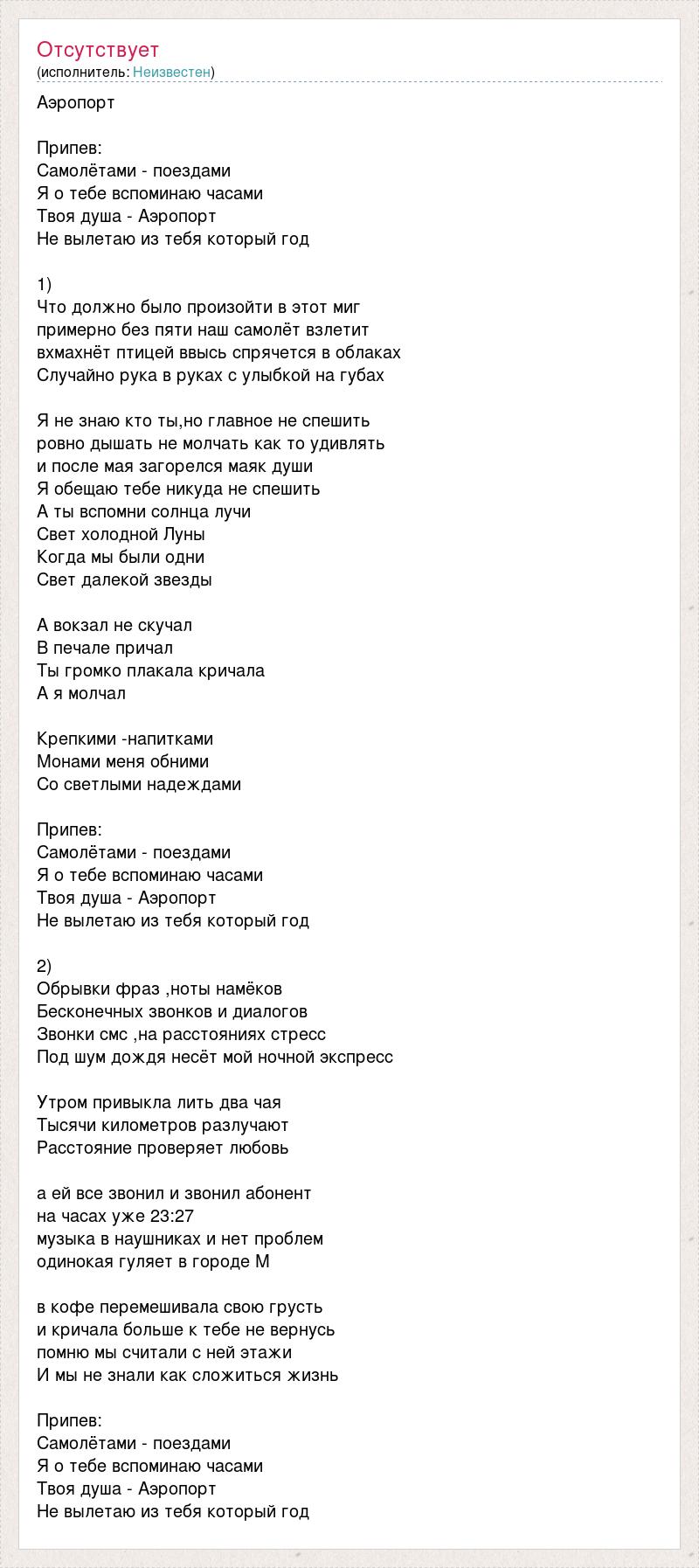 Аэропорт Припев: Самолётами - поездами Я о тебе вспоминаю часами Твоя душа - Аэропорт Не вылетаю из тебя который год 1) Что должно было произойти в этот миг примерно без пяти наш самолёт взлетит вхмахнёт птицей ввысь спрячется в облаках Случайно рука в руках с улыбкой на губах Я не знаю кто ты,но главное не спешить ровно дышать не молчать как то удивлять и после мая загорелся маяк души Я обещаю тебе никуда не спешить А ты вспомни солнца лучи Свет холодной Луны Когда мы были одни Свет далекой звезды А вокзал не скучал В печале причал Ты громко плакала кричала А я молчал Крепкими -напитками Монами меня обними Со светлыми надеждами Припев: Самолётами - поездами Я о тебе вспоминаю часами Твоя душа - Аэропорт Не вылетаю из тебя который год 2) Обрывки фраз ,ноты намёков Бесконечных звонков и диалогов Звонки смс ,на расстояниях стресс Под шум дождя несёт мой ночной экспресс Утром привыкла лить два чая Тысячи километров разлучают Расстояние проверяет любовь а ей все звонил и звонил абонент на часах уже 23:27 музыка в наушниках и нет проблем одинокая гуляет в городе М в кофе перемешивала свою грусть и кричала больше к тебе не вернусь помню мы считали с ней этажи И мы не знали как сложиться жизнь Припев: Самолётами - поездами Я о тебе вспоминаю часами Твоя душа - Аэропорт Не вылетаю из тебя который год