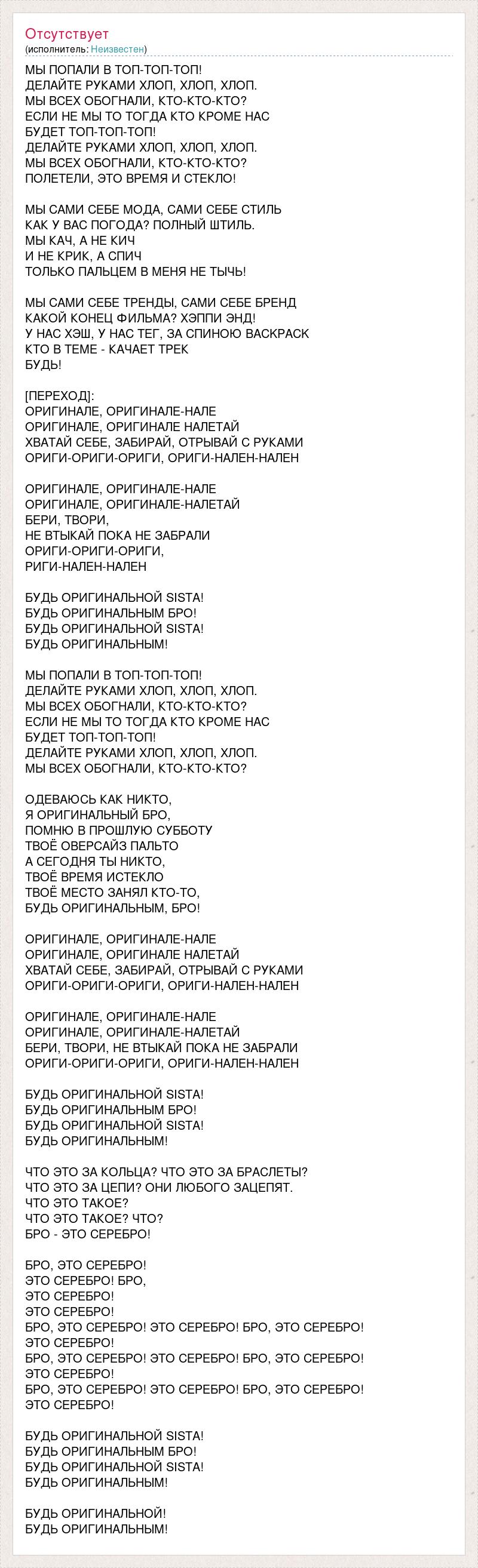 МЫ ПОПАЛИ В ТОП-ТОП-ТОП! ДЕЛАЙТЕ РУКАМИ ХЛОП, ХЛОП, ХЛОП. МЫ ВСЕХ ОБОГНАЛИ, КТО-КТО-КТО? ЕСЛИ НЕ МЫ ТО ТОГДА КТО КРОМЕ НАС БУДЕТ ТОП-ТОП-ТОП! ДЕЛАЙТЕ РУКАМИ ХЛОП, ХЛОП, ХЛОП. МЫ ВСЕХ ОБОГНАЛИ, КТО-КТО-КТО? ПОЛЕТЕЛИ, ЭТО ВРЕМЯ И СТЕКЛО! МЫ САМИ СЕБЕ МОДА, САМИ СЕБЕ СТИЛЬ КАК У ВАС ПОГОДА? ПОЛНЫЙ ШТИЛЬ. МЫ КАЧ, А НЕ КИЧ И НЕ КРИК, А СПИЧ ТОЛЬКО ПАЛЬЦЕМ В МЕНЯ НЕ ТЫЧЬ! МЫ САМИ СЕБЕ ТРЕНДЫ, САМИ СЕБЕ БРЕНД КАКОЙ КОНЕЦ ФИЛЬМА? ХЭППИ ЭНД! У НАС ХЭШ, У НАС ТЕГ, ЗА СПИНОЮ BACKPACK КТО В ТЕМЕ - КАЧАЕТ ТРЕК БУДЬ! [ПЕРЕХОД]: ОРИГИНАЛЕ, ОРИГИНАЛЕ-НАЛЕ ОРИГИНАЛЕ, ОРИГИНАЛЕ НАЛЕТАЙ ХВАТАЙ СЕБЕ, ЗАБИРАЙ, ОТРЫВАЙ С РУКАМИ ОРИГИ-ОРИГИ-ОРИГИ, ОРИГИ-НАЛЕН-НАЛЕН ОРИГИНАЛЕ, ОРИГИНАЛЕ-НАЛЕ ОРИГИНАЛЕ, ОРИГИНАЛЕ-НАЛЕТАЙ БЕРИ, ТВОРИ, НЕ ВТЫКАЙ ПОКА НЕ ЗАБРАЛИ ОРИГИ-ОРИГИ-ОРИГИ, РИГИ-НАЛЕН-НАЛЕН БУДЬ ОРИГИНАЛЬНОЙ SISTA! БУДЬ ОРИГИНАЛЬНЫМ БРО! БУДЬ ОРИГИНАЛЬНОЙ SISTA! БУДЬ ОРИГИНАЛЬНЫМ! МЫ ПОПАЛИ В ТОП-ТОП-ТОП! ДЕЛАЙТЕ РУКАМИ ХЛОП, ХЛОП, ХЛОП. МЫ ВСЕХ ОБОГНАЛИ, КТО-КТО-КТО? ЕСЛИ НЕ МЫ ТО ТОГДА КТО КРОМЕ НАС БУДЕТ ТОП-ТОП-ТОП! ДЕЛАЙТЕ РУКАМИ ХЛОП, ХЛОП, ХЛОП. МЫ ВСЕХ ОБОГНАЛИ, КТО-КТО-КТО? ОДЕВАЮСЬ КАК НИКТО, Я ОРИГИНАЛЬНЫЙ БРО, ПОМНЮ В ПРОШЛУЮ СУББОТУ ТВОЁ ОВЕРСАЙЗ ПАЛЬТО А СЕГОДНЯ ТЫ НИКТО, ТВОЁ ВРЕМЯ ИСТЕКЛО ТВОЁ МЕСТО ЗАНЯЛ КТО-ТО, БУДЬ ОРИГИНАЛЬНЫМ, БРО! ОРИГИНАЛЕ, ОРИГИНАЛЕ-НАЛЕ ОРИГИНАЛЕ, ОРИГИНАЛЕ НАЛЕТАЙ ХВАТАЙ СЕБЕ, ЗАБИРАЙ, ОТРЫВАЙ С РУКАМИ ОРИГИ-ОРИГИ-ОРИГИ, ОРИГИ-НАЛЕН-НАЛЕН ОРИГИНАЛЕ, ОРИГИНАЛЕ-НАЛЕ ОРИГИНАЛЕ, ОРИГИНАЛЕ-НАЛЕТАЙ БЕРИ, ТВОРИ, НЕ ВТЫКАЙ ПОКА НЕ ЗАБРАЛИ ОРИГИ-ОРИГИ-ОРИГИ, ОРИГИ-НАЛЕН-НАЛЕН БУДЬ ОРИГИНАЛЬНОЙ SISTA! БУДЬ ОРИГИНАЛЬНЫМ БРО! БУДЬ ОРИГИНАЛЬНОЙ SISTA! БУДЬ ОРИГИНАЛЬНЫМ! ЧТО ЭТО ЗА КОЛЬЦА? ЧТО ЭТО ЗА БРАСЛЕТЫ? ЧТО ЭТО ЗА ЦЕПИ? ОНИ ЛЮБОГО ЗАЦЕПЯТ. ЧТО ЭТО ТАКОЕ? ЧТО ЭТО ТАКОЕ? ЧТО? БРО - ЭТО СЕРЕБРО! БРО, ЭТО СЕРЕБРО! ЭТО СЕРЕБРО! БРО, ЭТО СЕРЕБРО! ЭТО СЕРЕБРО! БРО, ЭТО СЕРЕБРО! ЭТО СЕРЕБРО! БРО, ЭТО СЕРЕБРО! ЭТО СЕРЕБРО! БРО, ЭТО СЕРЕБРО! ЭТО СЕРЕБРО! БРО, ЭТО СЕРЕБРО! ЭТО СЕРЕБРО! БРО, ЭТО СЕРЕБРО! ЭТО СЕРЕБРО! БРО, ЭТО СЕРЕБРО! ЭТО СЕРЕБРО! БУДЬ ОРИГИНАЛЬНОЙ SISTA! БУДЬ ОРИГИНАЛЬНЫМ БРО! БУДЬ ОРИГИНАЛЬНОЙ SISTA! БУДЬ ОРИГИНАЛЬНЫМ! БУДЬ ОРИГИНАЛЬНОЙ! БУДЬ ОРИГИНАЛЬНЫМ!