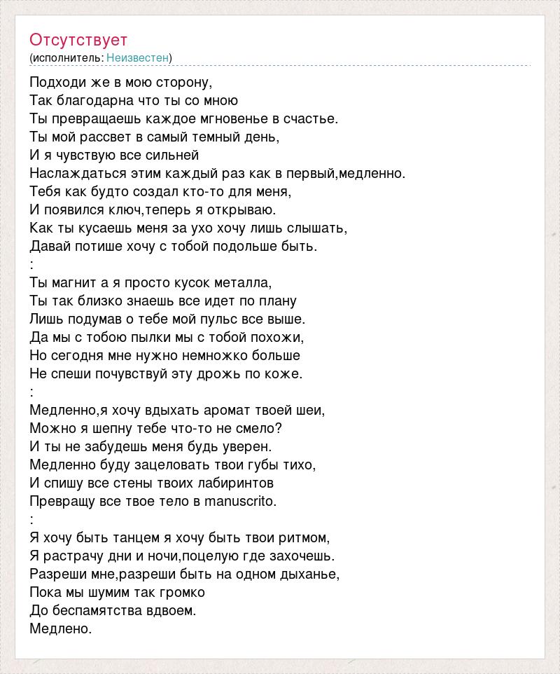 Подходи же в мою сторону, Так благодарна что ты со мною Ты превращаешь каждое мгновенье в счастье. Ты мой рассвет в самый темный день, И я чувствую все сильней Наслаждаться этим каждый раз как в первый,медленно. Тебя как будто создал кто-то для меня, И появился ключ,теперь я открываю. Как ты кусаешь меня за ухо хочу лишь слышать, Давай потише хочу с тобой подольше быть. : Ты магнит а я просто кусок металла, Ты так близко знаешь все идет по плану Лишь подумав о тебе мой пульс все выше. Да мы с тобою пылки мы с тобой похожи, Но сегодня мне нужно немножко больше Не спеши почувствуй эту дрожь по коже. : Медленно,я хочу вдыхать аромат твоей шеи, Можно я шепну тебе что-то не смело? И ты не забудешь меня будь уверен. Медленно буду зацеловать твои губы тихо, И спишу все стены твоих лабиринтов Превращу все твое тело в manuscrito. : Я хочу быть танцем я хочу быть твои ритмом, Я растрачу дни и ночи,поцелую где захочешь. Разреши мне,разреши быть на одном дыханье, Пока мы шумим так громко До беспамятства вдвоем. Медлено.